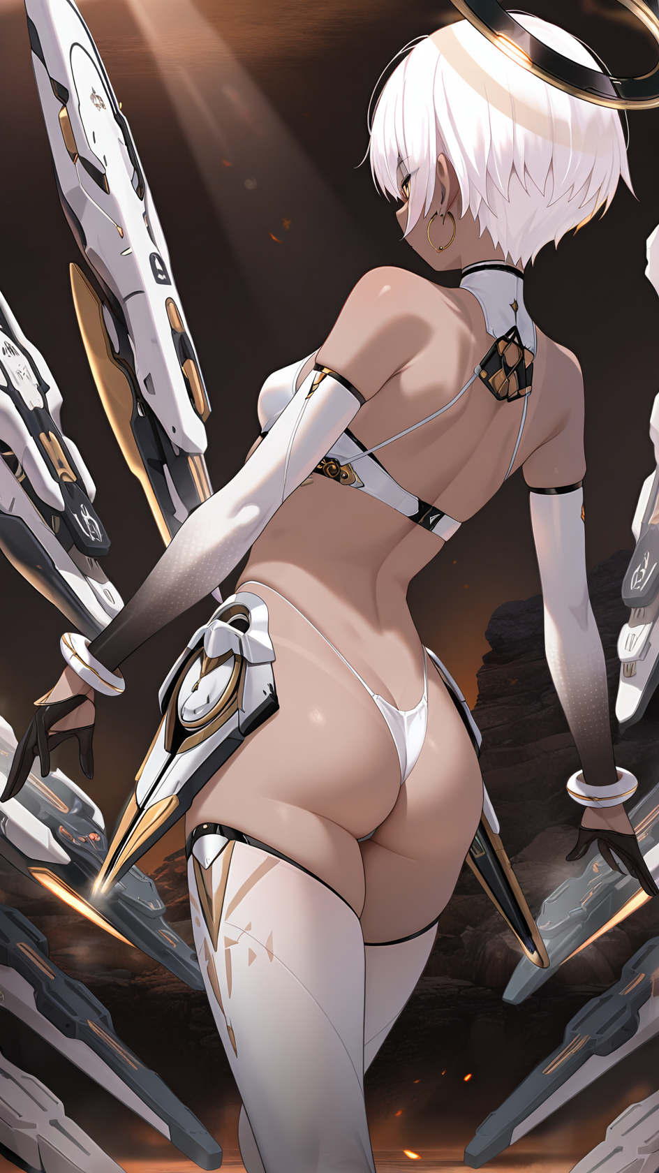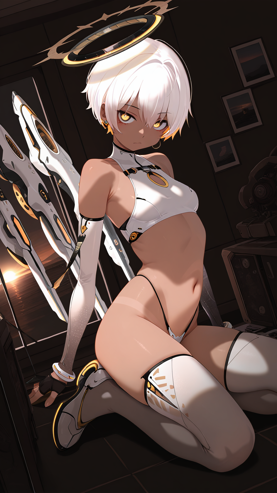 예시 프롬프트: 1girl, solo, breasts, short hair, bangs,, thighhighs, gloves, navel, hair between eyes, bare shoulders, jewelry, underwear, panties, yellow eyes, white hair, earrings, small breasts, wings, black gloves, elbow gloves, white gloves, dark skin, fingerless gloves, stomach, white panties, white thighhighs, dark-skinned female, crop top, highleg, highleg panties, halo, mechanical wings