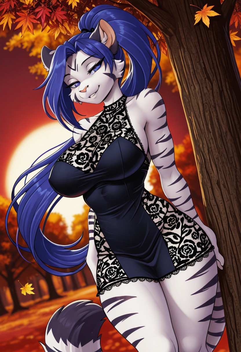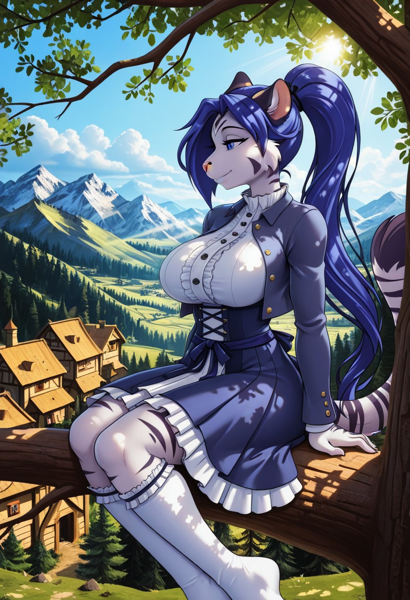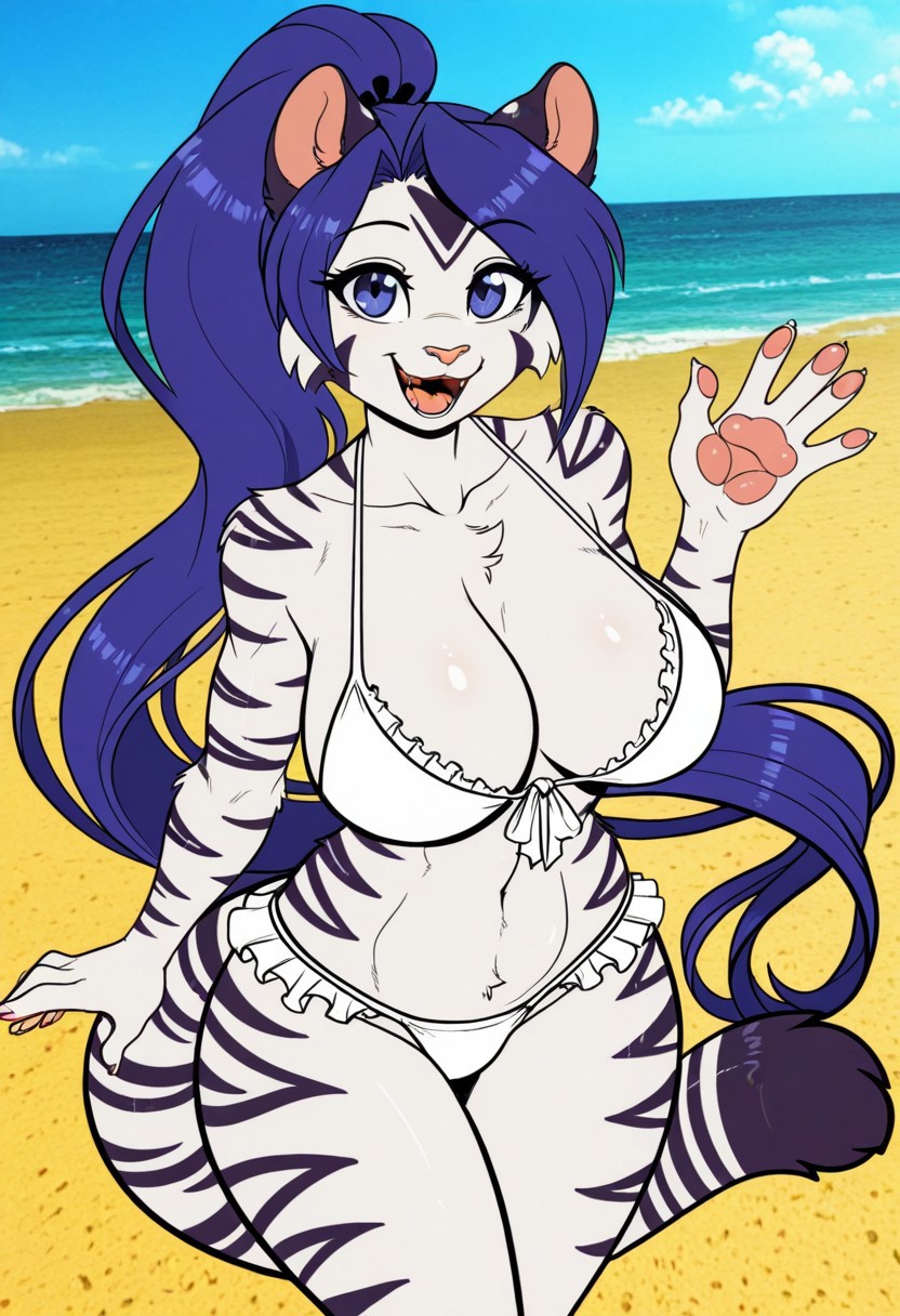 soya_akane_sd, 1girl, solo, long hair, breasts, animal ears, furry, furry female, blue hair, tail, ponytail, blue eyes, large breasts, body fur, very long hair, snout, tiger ears, white fur, animal nose,