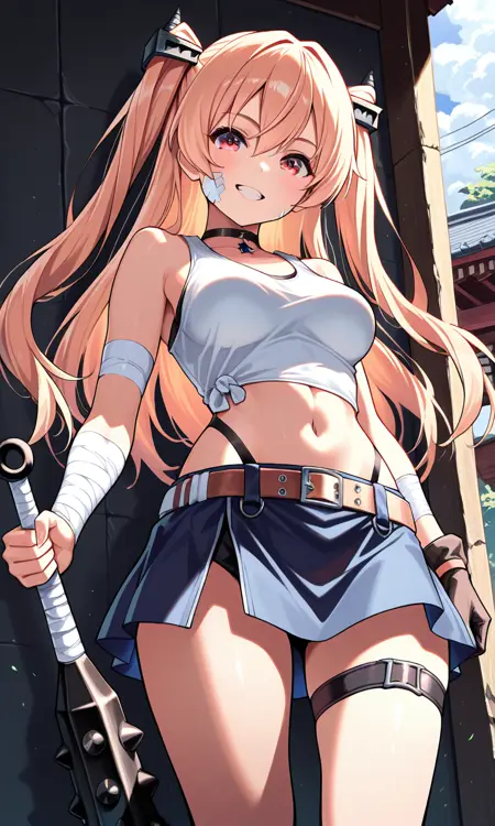 Setsubun outfit : johnstonsbKC, long hair, skirt, gloves, navel, hair between eyes, medium breasts, choker, midriff, two side up, blue skirt, thigh strap, bandages, tank top, single glove, bandaged arm,