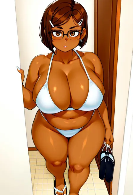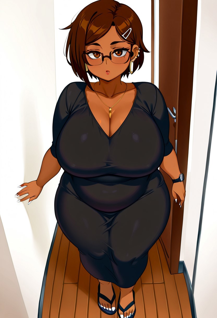 alisa, 1girl, dark-skinned female, chubby anime girl, big breasts, brown hair, hairclip, glasses, brown lenses, brown eyes, earrings, white fingernails, white toenails