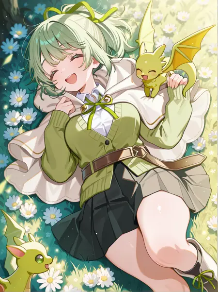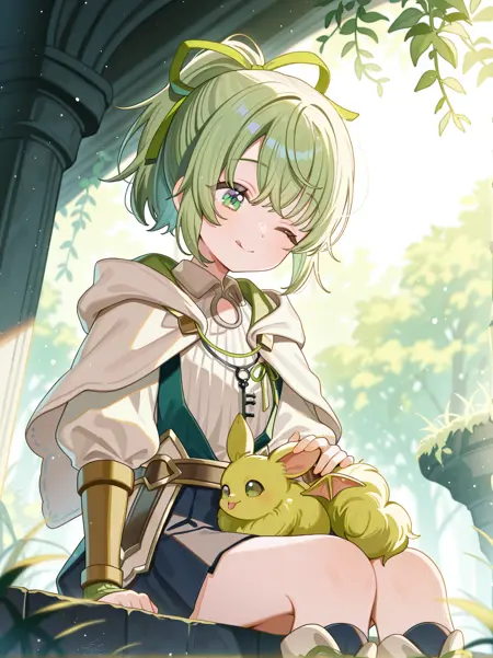 Tags (clothes1): bracer,brown belt,boots,black skirt,white hooded capelet,,green ribbon,key necklace,thigh strap,white shirt,