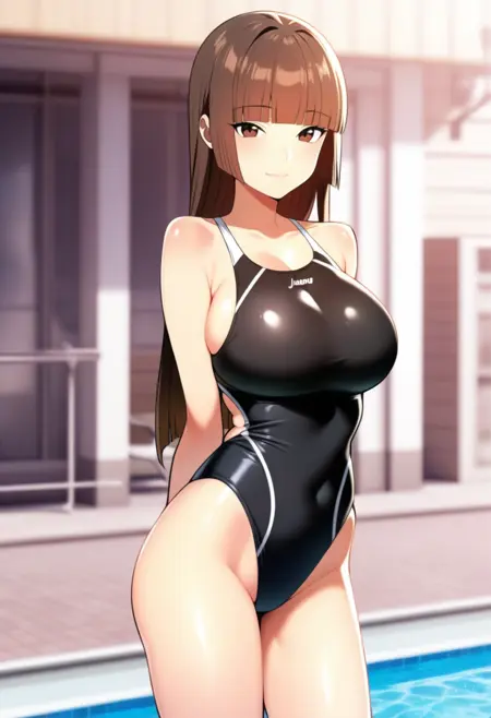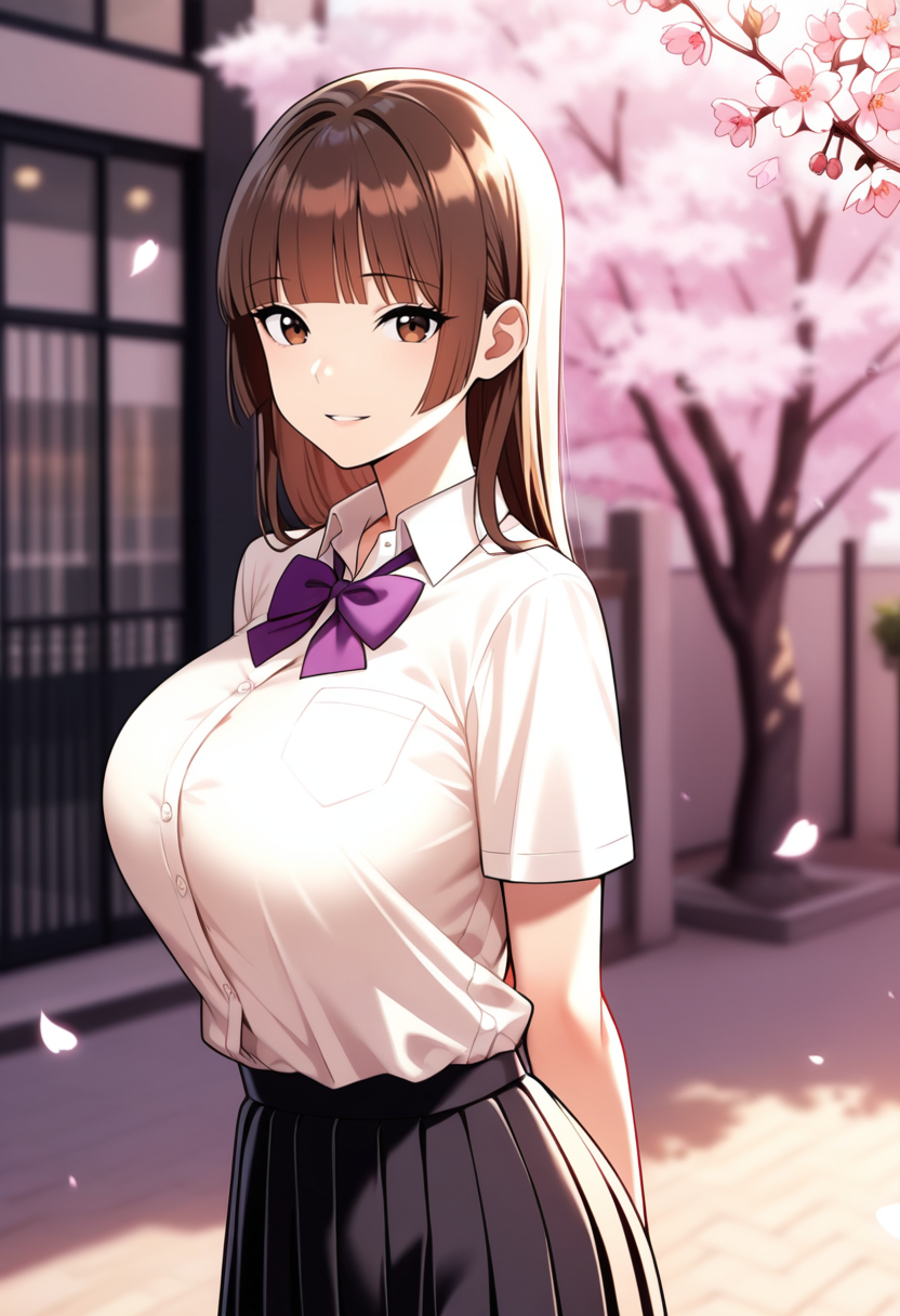 갈색 눈, 갈색 머리, 둔한 앞머리, 긴 머리