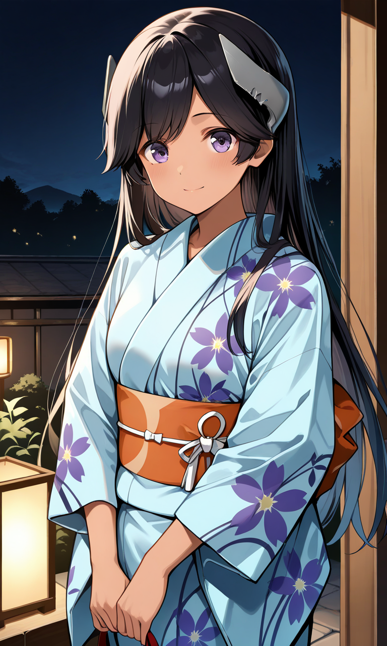 浴衣の衣装: I400KC、黒髪、長髪、着物、帯、頭部装具、オレンジ色の帯、花柄、肌色、浴衣、薄青色の着物