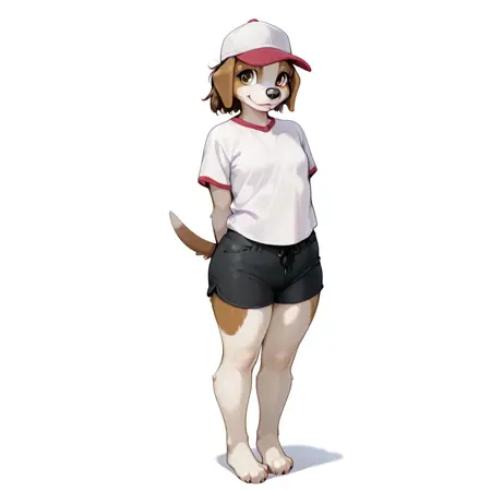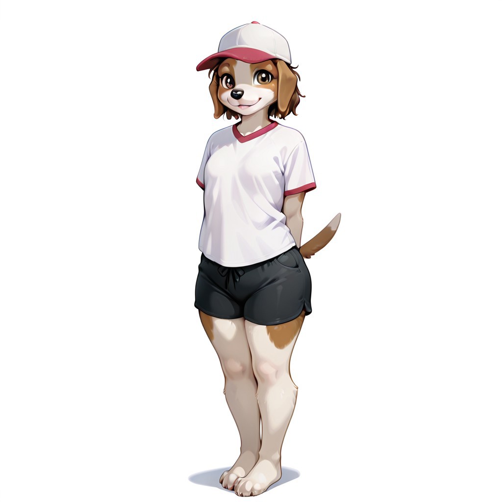 dog, dog girl, beagle, brown and white fur, brown hair, short hair, brown eyes, black nose, dog ears, dog tail, Plump, small breasts,