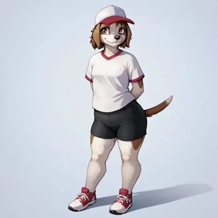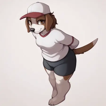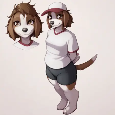 dog, dog girl, beagle, brown and white fur, brown hair, short hair, brown eyes, black nose, dog ears, dog tail, Plump, small breasts,