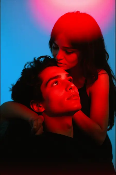 一张由专业摄影师使用复古 35 毫米胶片相机拍摄的照片。照片具有电影般的构图,细微的模拟胶片颗粒赋予其复古质感。照片中的主体呈现出赛博朋克与复古未来主义的美学风格。