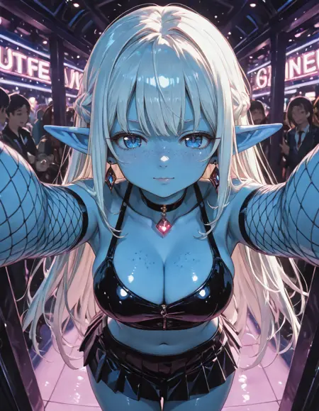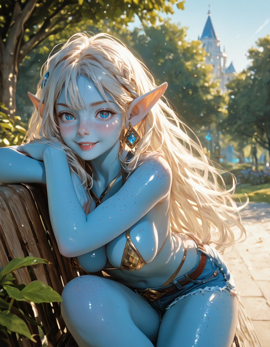blue eyes, freckles, lliam, elf, blue skin, azure skin, white hair, pointed elven ears,