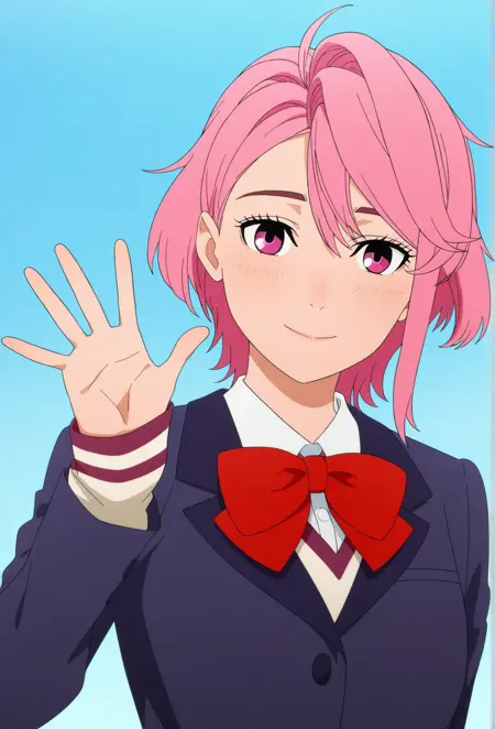 <lora:Shiratori AiraV1-Nuclear1811-IL:1>,Shiratori Aira,pink eyes,pink hair,short hair,ahoge,bangs,ch1 school uniform,ch1 jacket,ch1 blue jacket,ch1 blazer,ch1 pocket,ch1 long sleeves,ch1 buttons,ch1 bow,ch1 red bow,ch1 bowtie,ch1 red bowtie,ch1 shirt,ch1 white shirt,ch1 collared shirt,ch1 skirt,ch1 light purple skirt,ch1 pleated skirt,ch1 miniskirt,ch1 socks,ch1 white socks,ch1 kneehighs,