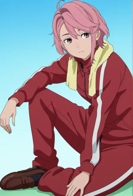 <lora:Shiratori AiraV1-Nuclear1811-IL>,Shiratori Aira,pink eyes,pink hair,short hair,ahoge,bangs,ch3 track suit,ch3 red track suit,ch3 jacket,ch3 red jacket,ch3 track jacket,ch3 zipper,ch3 black zipper pull tab,ch3 long sleeves,ch3 pants,ch3 red pants,ch3 track pants,sh2 shoes,sh2 brown footwear,sh2 loafers,