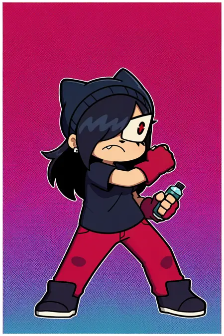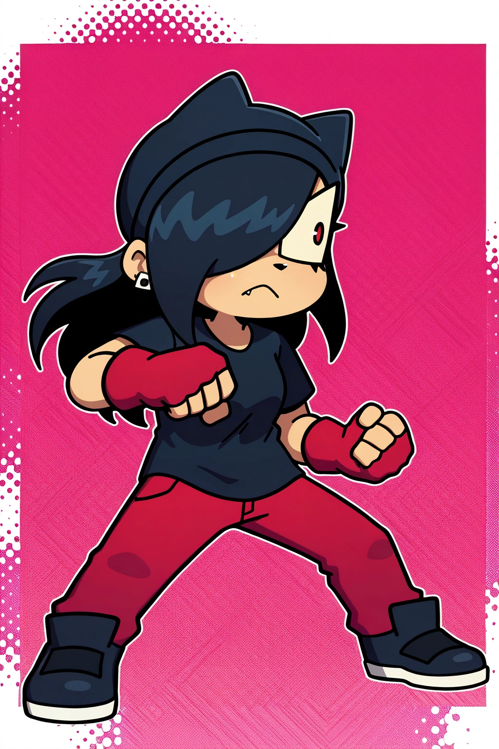 LegacyAnnieFNFHR, 1girl, light gold-tinted skin, red square eyes, green-blue sharp long hair over one eye, catlike off-black beanie, off-black shirt, red pants, red long fingerless gloves, black sneakers, white earrings, short, chibi,