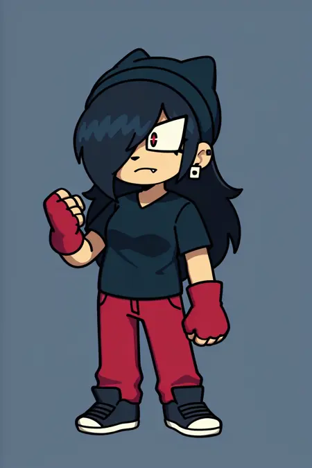 | トレーニングワード | LegacyAnnieFNFHR, 1girl, light gold-tinted skin, red square eyes, green-blue sharp long hair over one eye, catlike off-black beanie, off-black shirt, red pants, red long fingerless gloves, black sneakers, white earrings, short, chibi,コピーしました! |