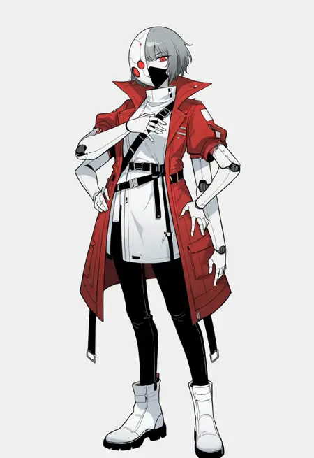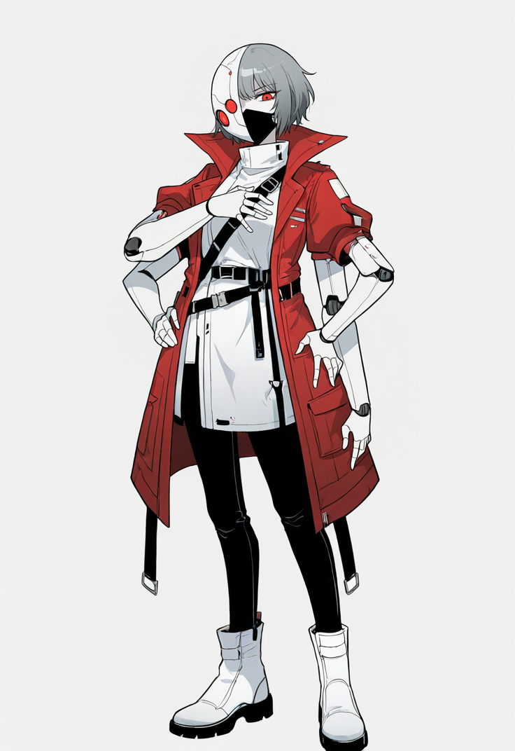 | 训练词汇 | multiple arms, extra arms, white mechanical arms, joints, pale skin, dark grey hair, short hair, red eyes已复制! white robe, black belt, black shoulder strap, red coat, open coat, short sleeves, black pants, white boots已复制! half-face mask, black mouth mask已复制! |