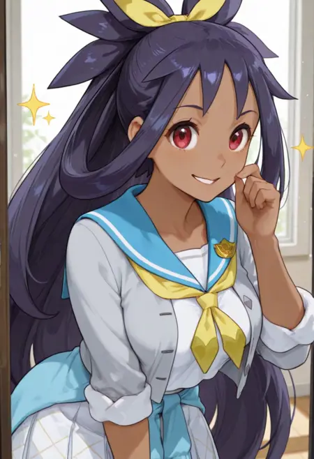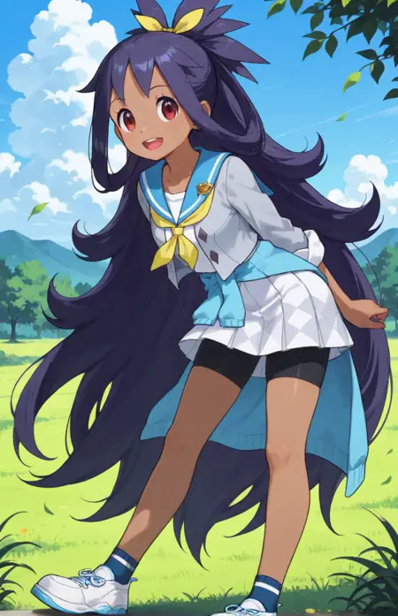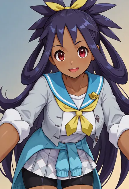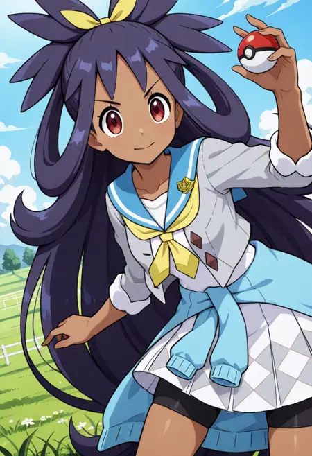 aciris, 성숙한 외모, 성숙한 여성, 이리스 \(포켓몬\), 붉은 눈, 보라색 머리, 매우 긴 머리, 검은 피부의 여성, 머리 띠, 노랑색 띠