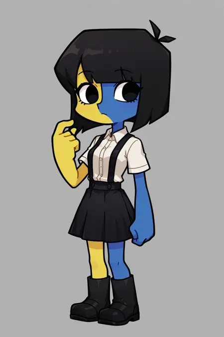 EnaFNF, 1girl, colored skin, black hair, yellow skin, blue skin, black eyes, suspenders, shirt, short sleeves, black skirt, two tone skin, short, chibi, low poly,