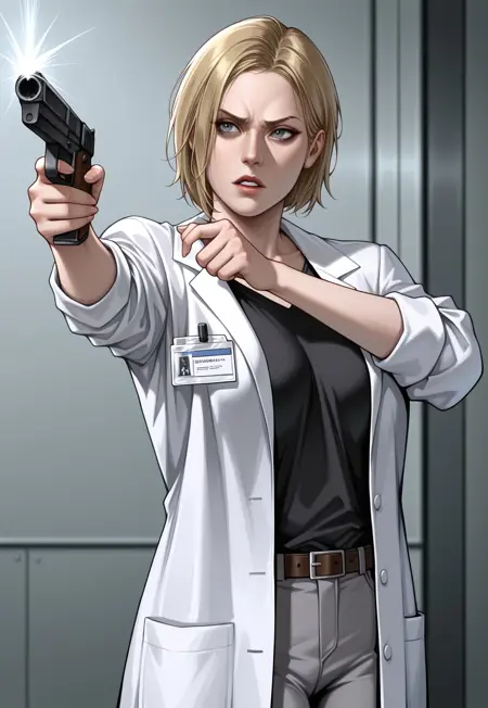 - 实验室外套,袖子卷起,灰色衬衫,牛仔裤,