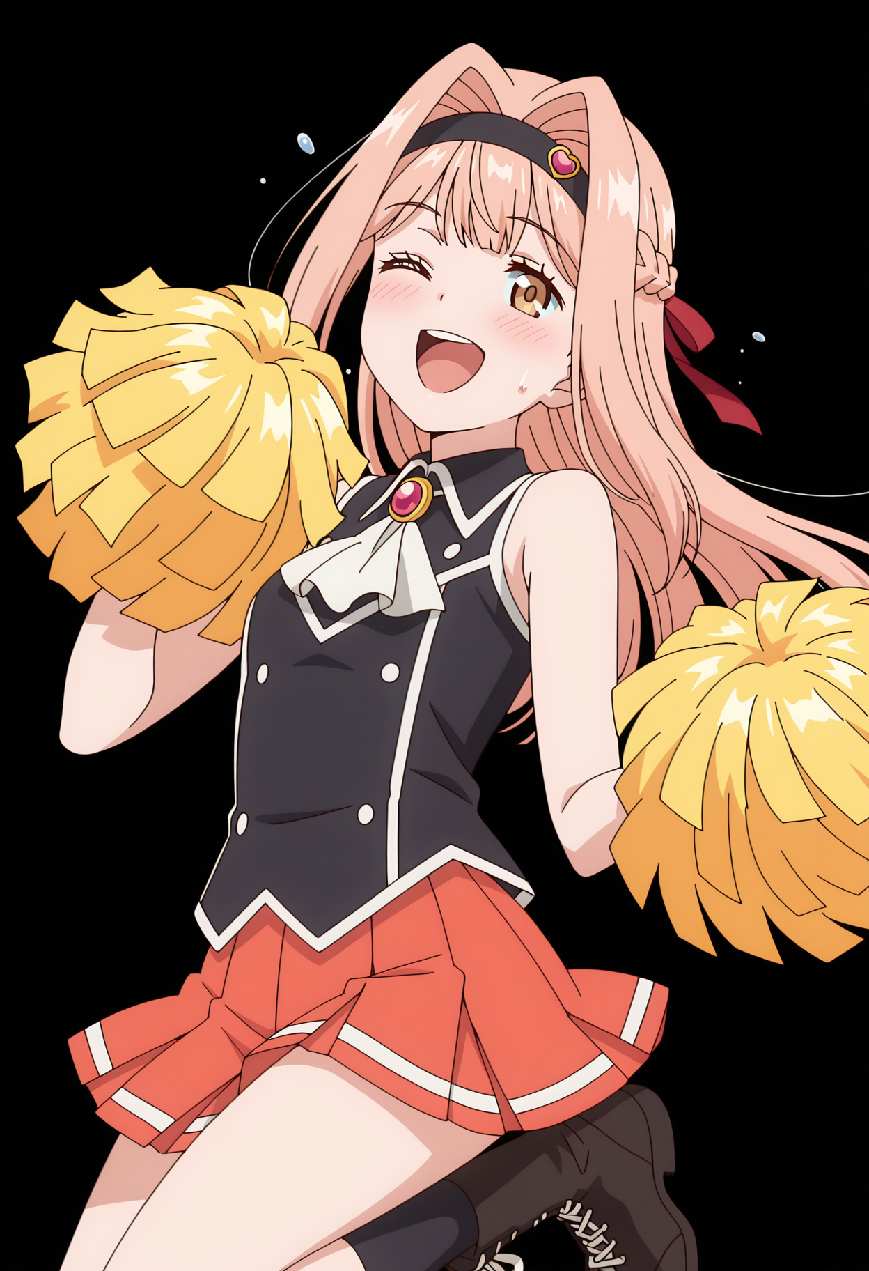 skirt, red gloves, pleated skirt, hairband, sleeveless, miniskirt, white ascot, buttons, headband, brooch, black socks, boots, red skirt, black shirt