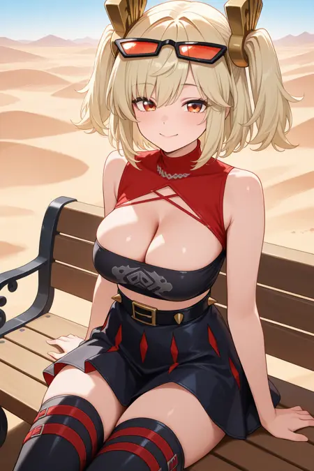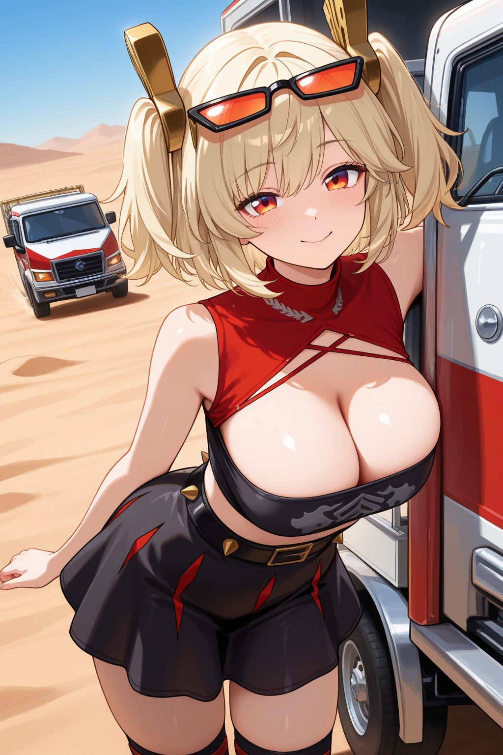 aaburnice, 红色眼睛, 金色头发, 两侧上扎, 头饰, burnicedef, 眼镜戴在头上, 红色高领衫, 黑色胸带, 黑色背心, 露胸剪裁, 裸露手臂, 黑色短裙, 高腰裙, 黑色大腿靴, 高跟靴,