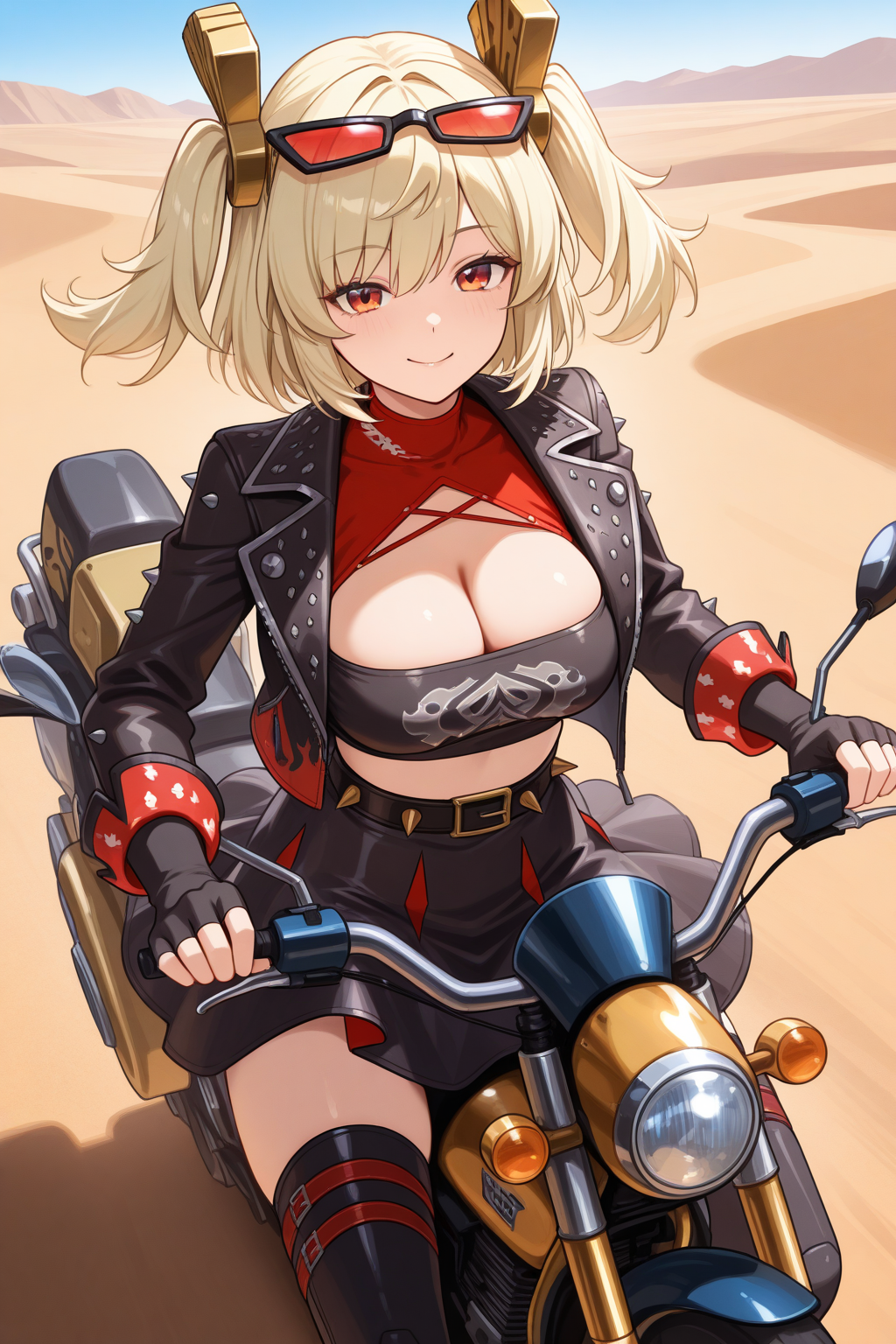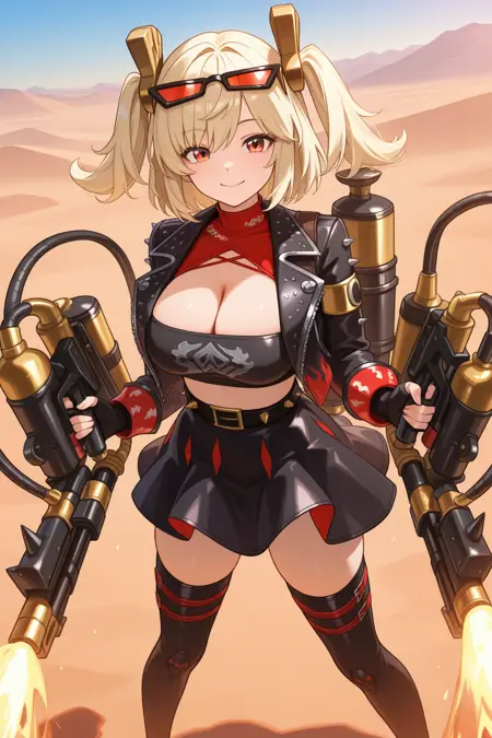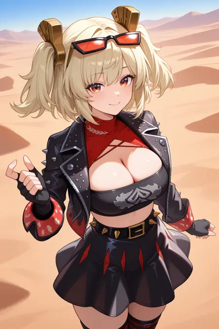 aaburnice, 红色眼睛, 金色头发, 两侧上扎, 头饰, burnicedef, 眼镜戴在头上, 红色高领衫, 黑色胸带, 黑色背心, 露胸剪裁, 黑色夹克, 带钉夹克, 黑色皮夹克, 黑色手套, 无指手套, 黑色短裙, 高腰裙, 黑色大腿靴, 高跟靴,