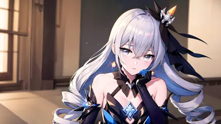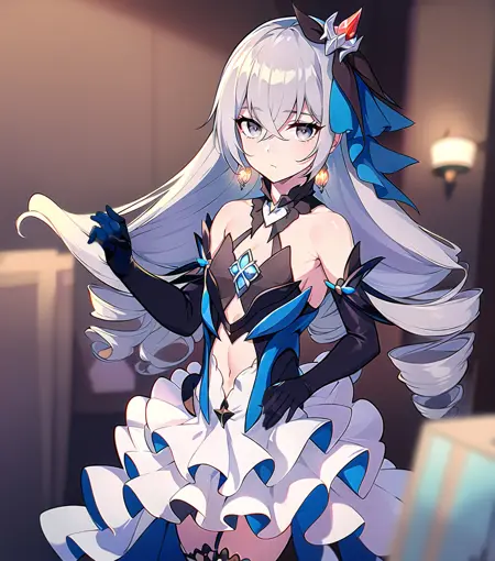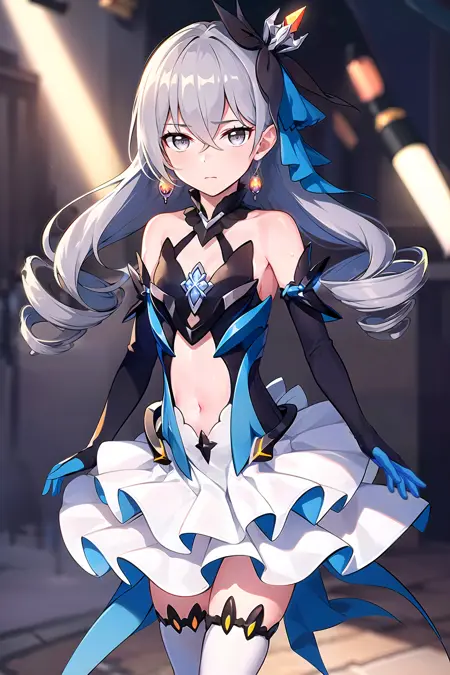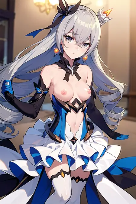 1girl,bronya,herrscher_of_reason,grey eyes, grey hair,drills,hair_ornament, earrings,gloves,elbow gloves,layered dress, jewelry,small breasts,white thighhighs,sweat, shy,looking at viewer,