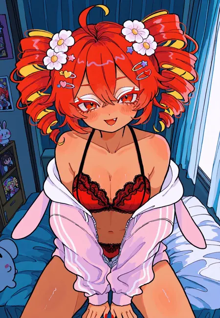 gkt,1girl,dark-skinned female,twin drills,ahoge,red hair,red eyes,yellow inner hair,white makeup,eyeshadow,lipgloss,blush,colored eyelashes,aegyo sal,long fingernails,nail polish,hair ornament,hair flower,heart hairpin,star hairpin,
