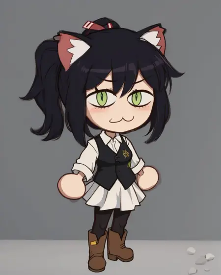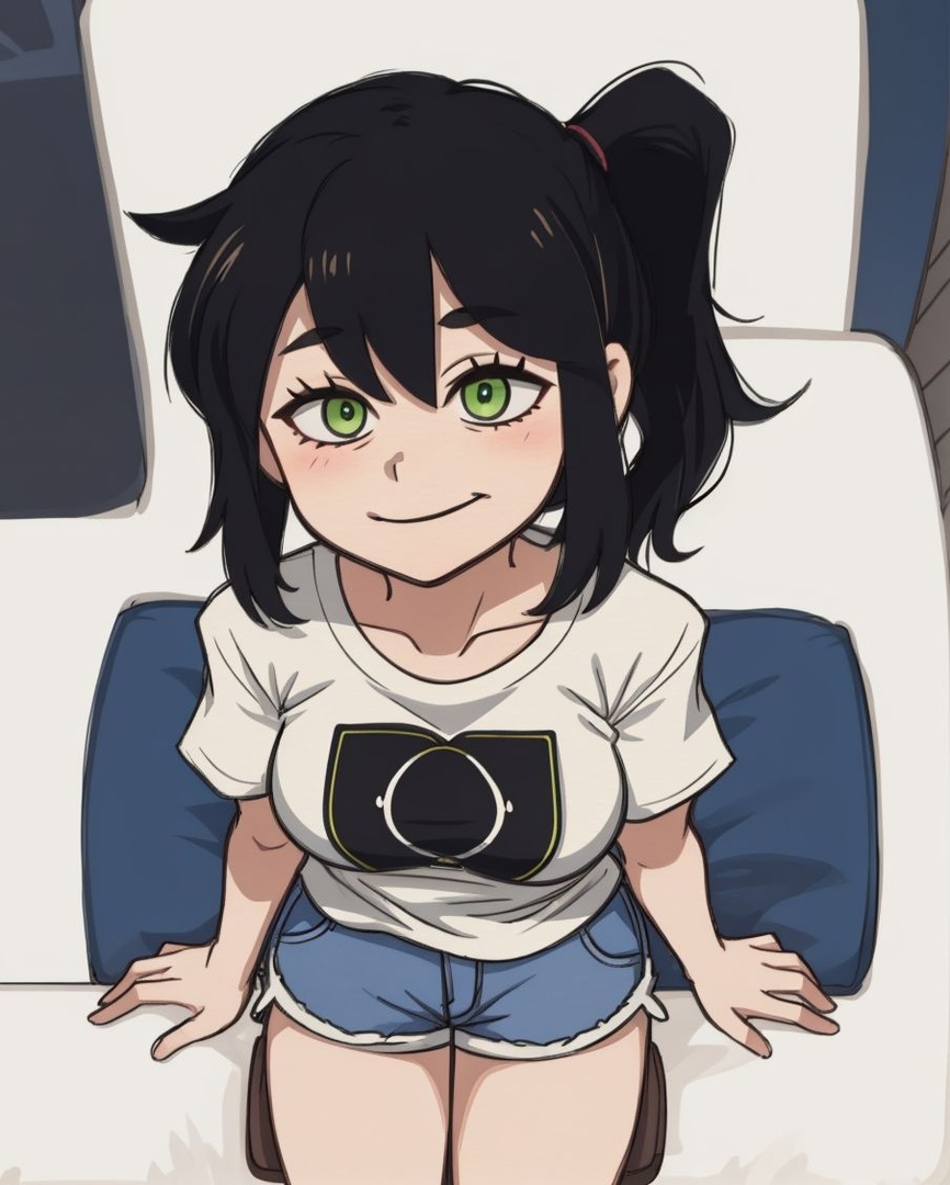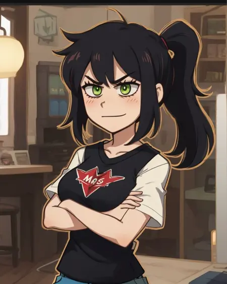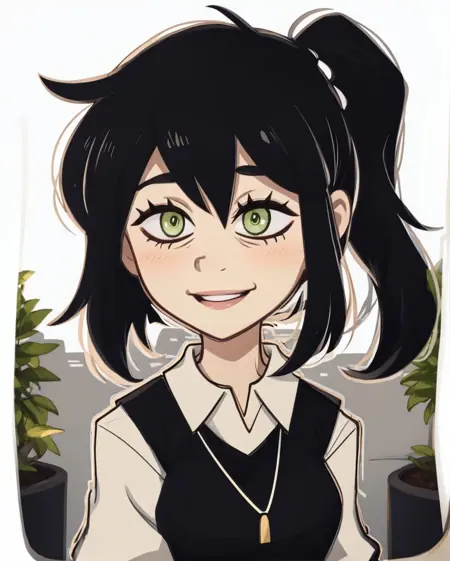 有用标签:(mrsgraves:1.1), 1girl, solo, shirt, black hair, ponytail, sidelocks, necklace, vest, collared shirt, upper body, (green eyes:.8), black hair,