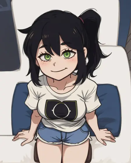 유용한 태그: (mrsgraves:1.1), 1girl, solo, shirt, black hair, ponytail, sidelocks, necklace, vest, collared shirt, upper body, (green eyes:.8), black hair,