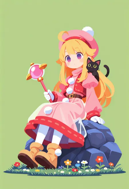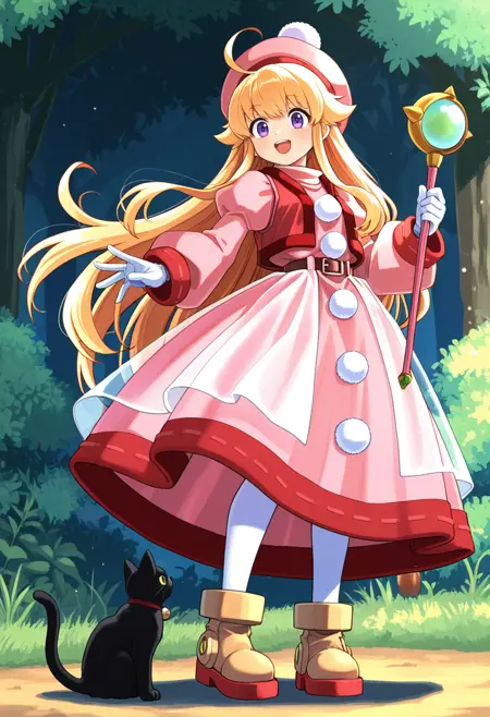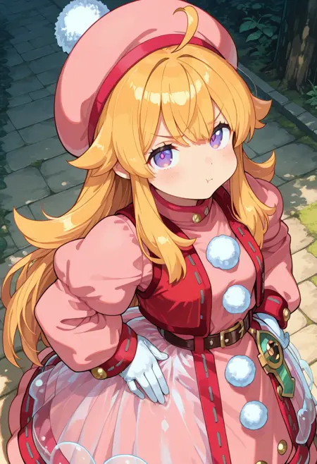 pink hat, tam o' shanter, pink_long_dress, puffy sleeves, long sleeves, white_gloves, red_trimmed_dress, red_vest, belt, see-through overskirt, white pom pom \(clothes\), white pantyhose, pipiro_boots,