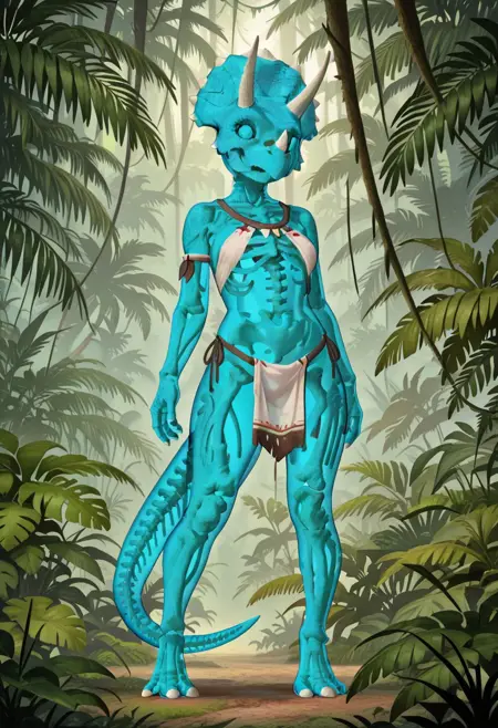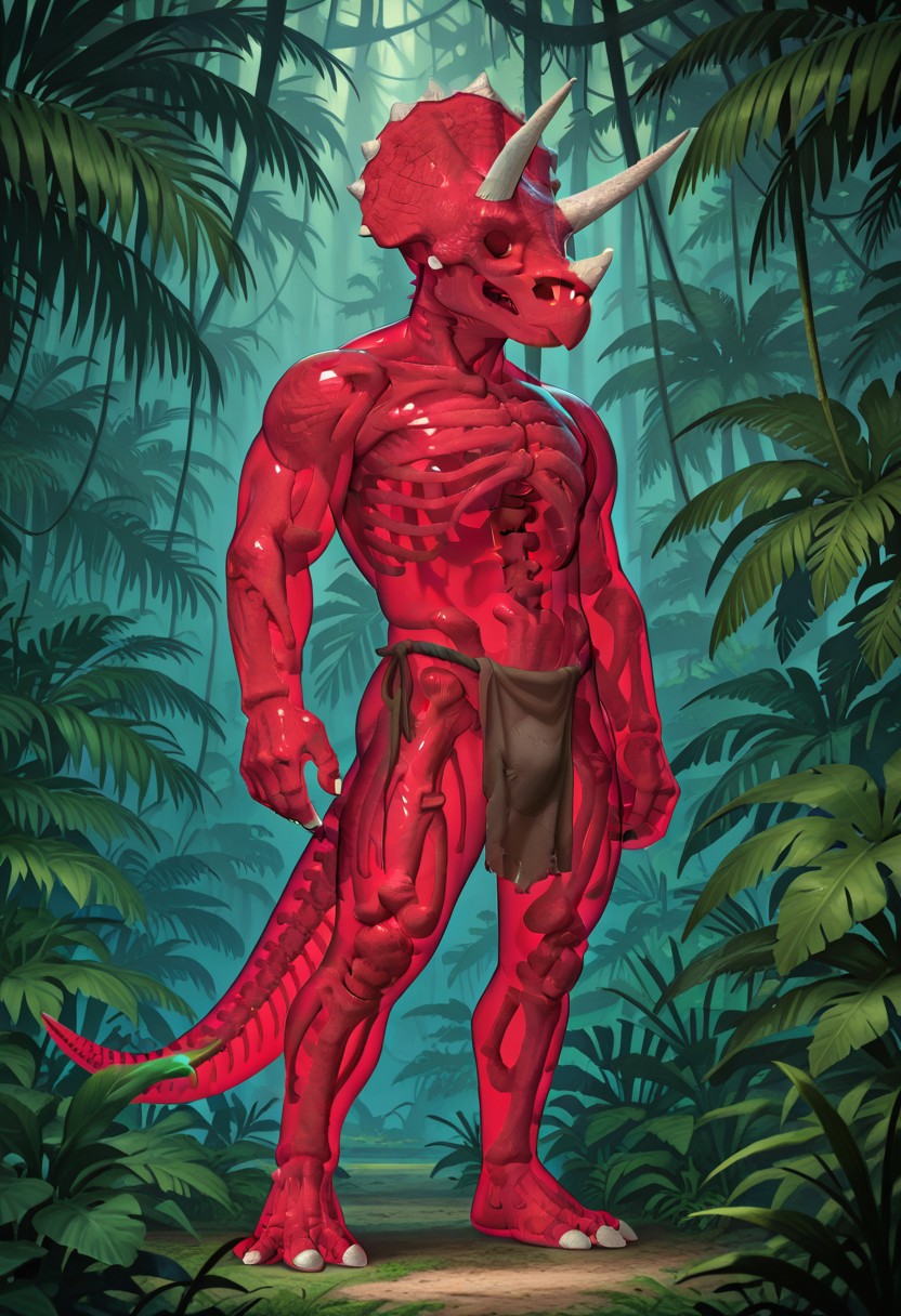 anthro, Triceratops, reptilian, three horns, skeleton, transparent green skin, slime skin