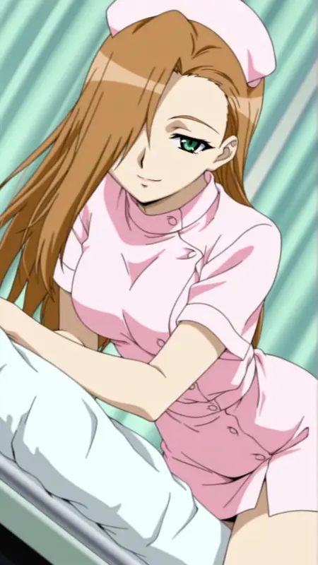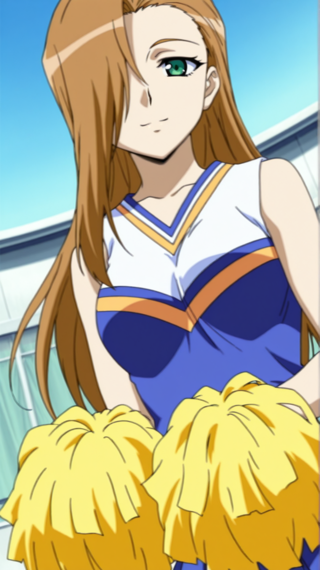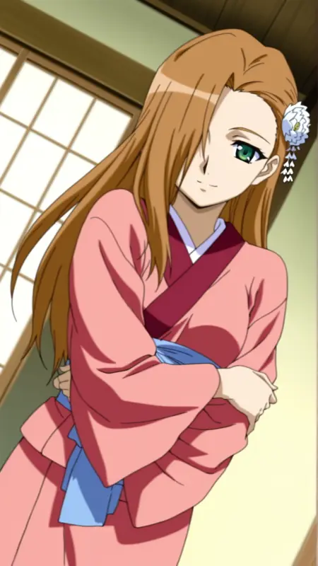 外見: 茶色の髪、長い髪、片方の目に髪がかかる、緑の目、
