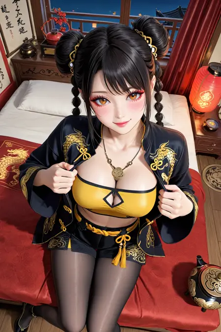 触发词(Trigger word):blue dream,pantyhose,braid,chinese clothes,black footwear,shorts,crop top,dragon print,necklace,tube top,yellow_top,