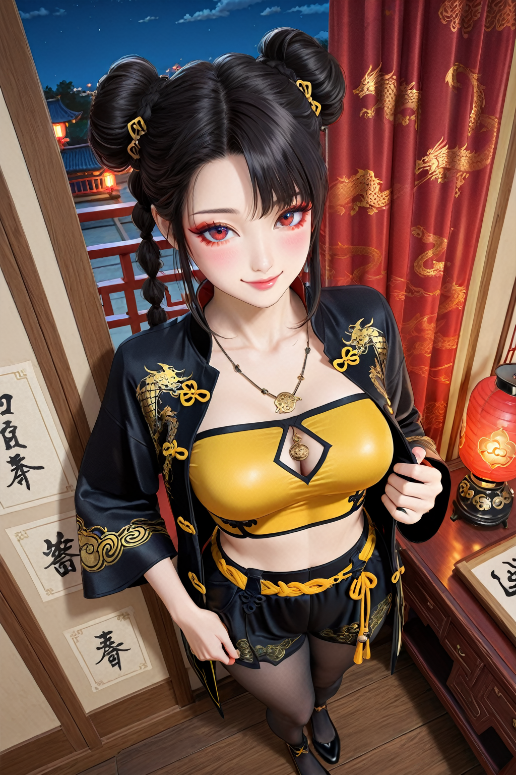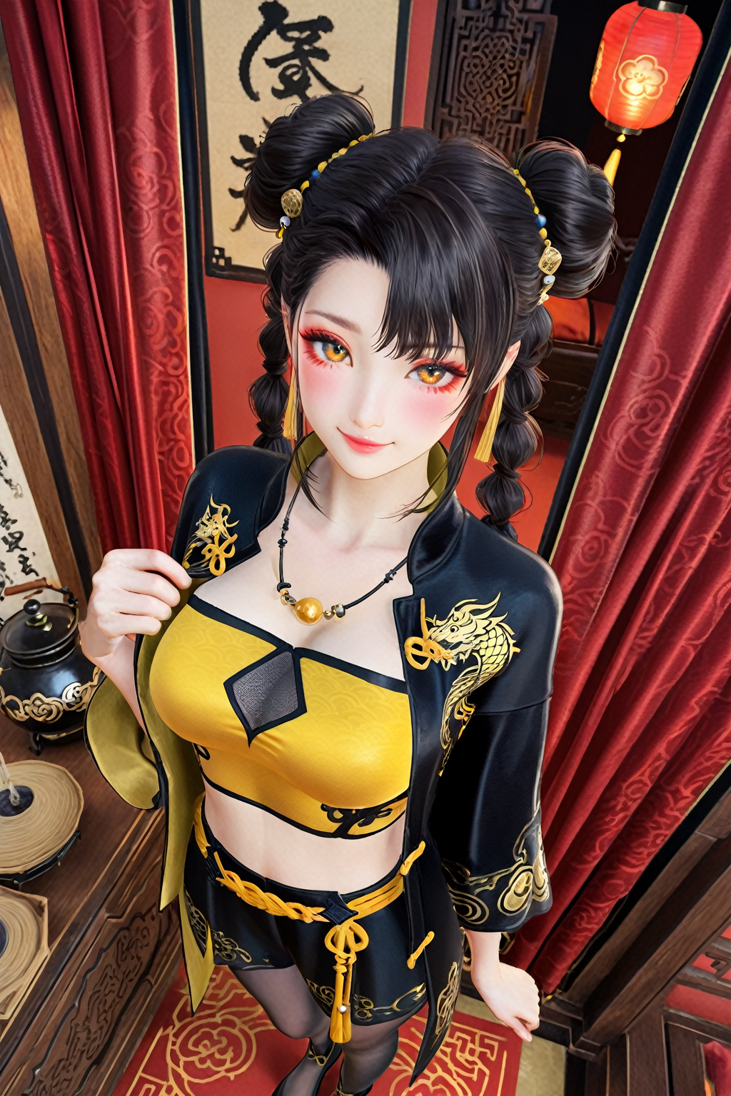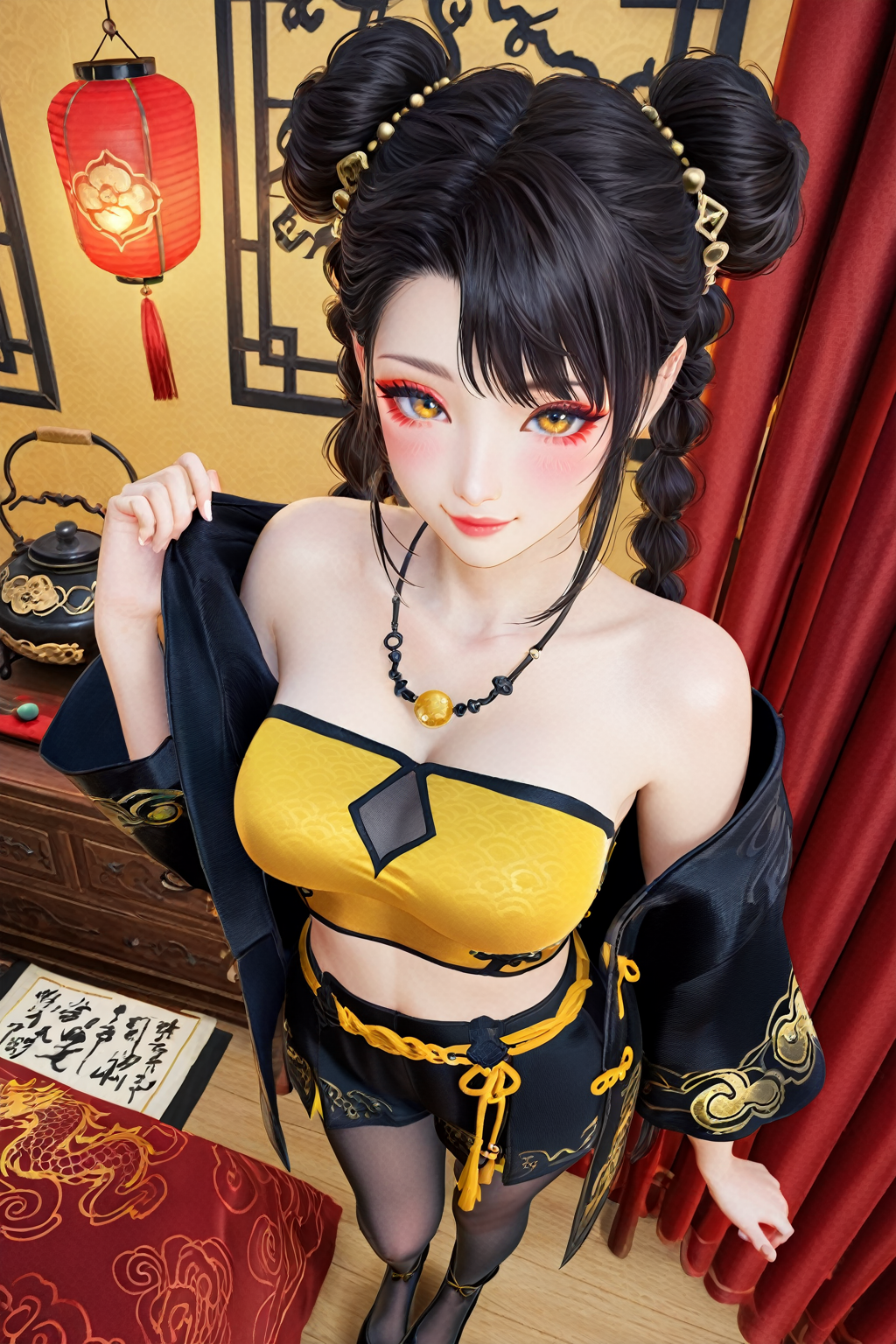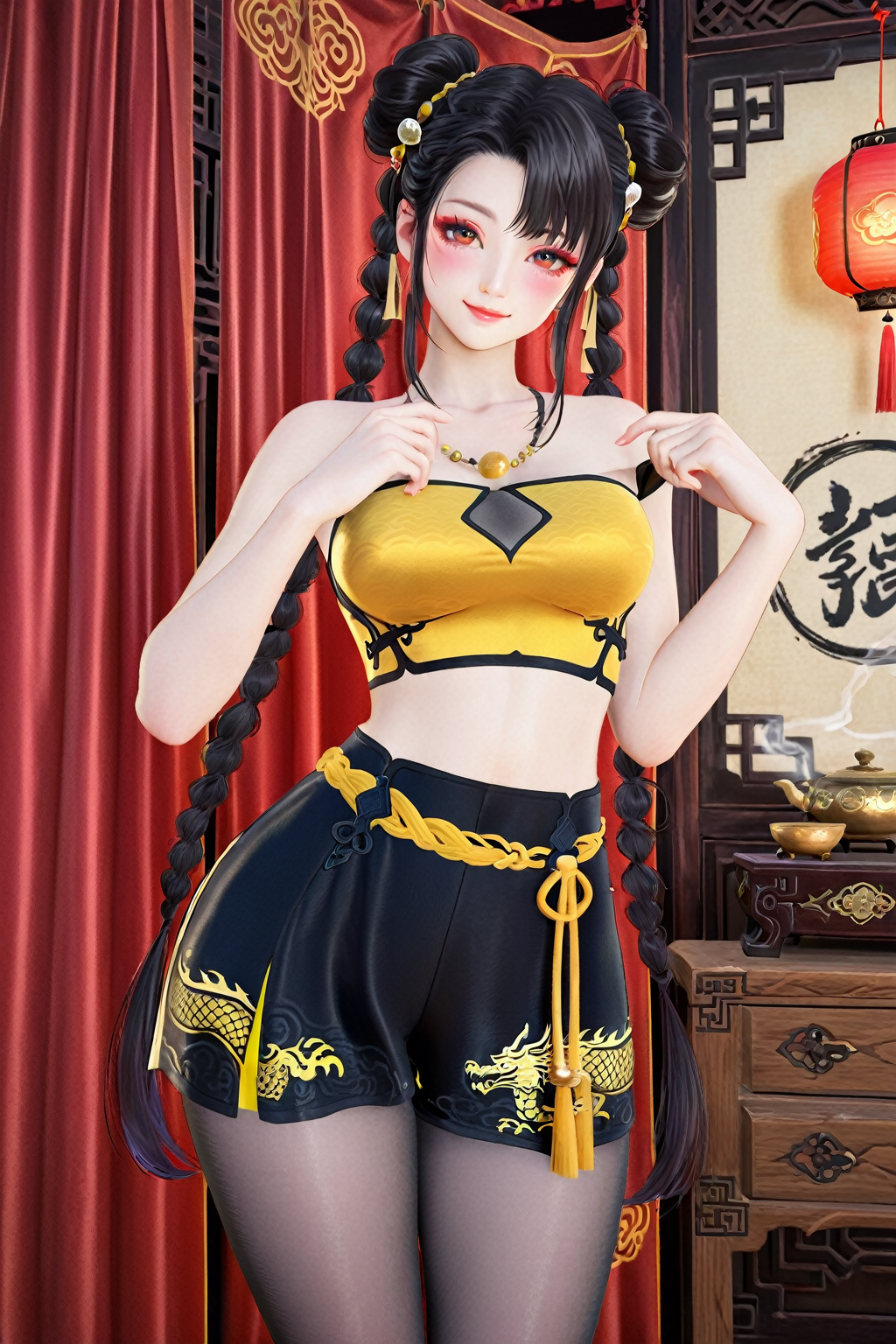 トリガー語(Trigger word)****: blue dream,pantyhose,braid,chinese clothes,black footwear,shorts,crop top,dragon print,necklace,tube top,yellow_top,