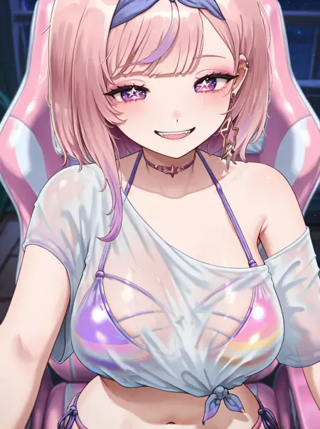 プロンプト: essievtuber, 1girl, ピンクの髪, スイムウェア, ビキニ, 笑顔, essieoutfit1, 異色瞳, 紫の目, 多色の髪, ジュエリー, シャツ, 透け感, おへそ, 星(記号), チョーカー、