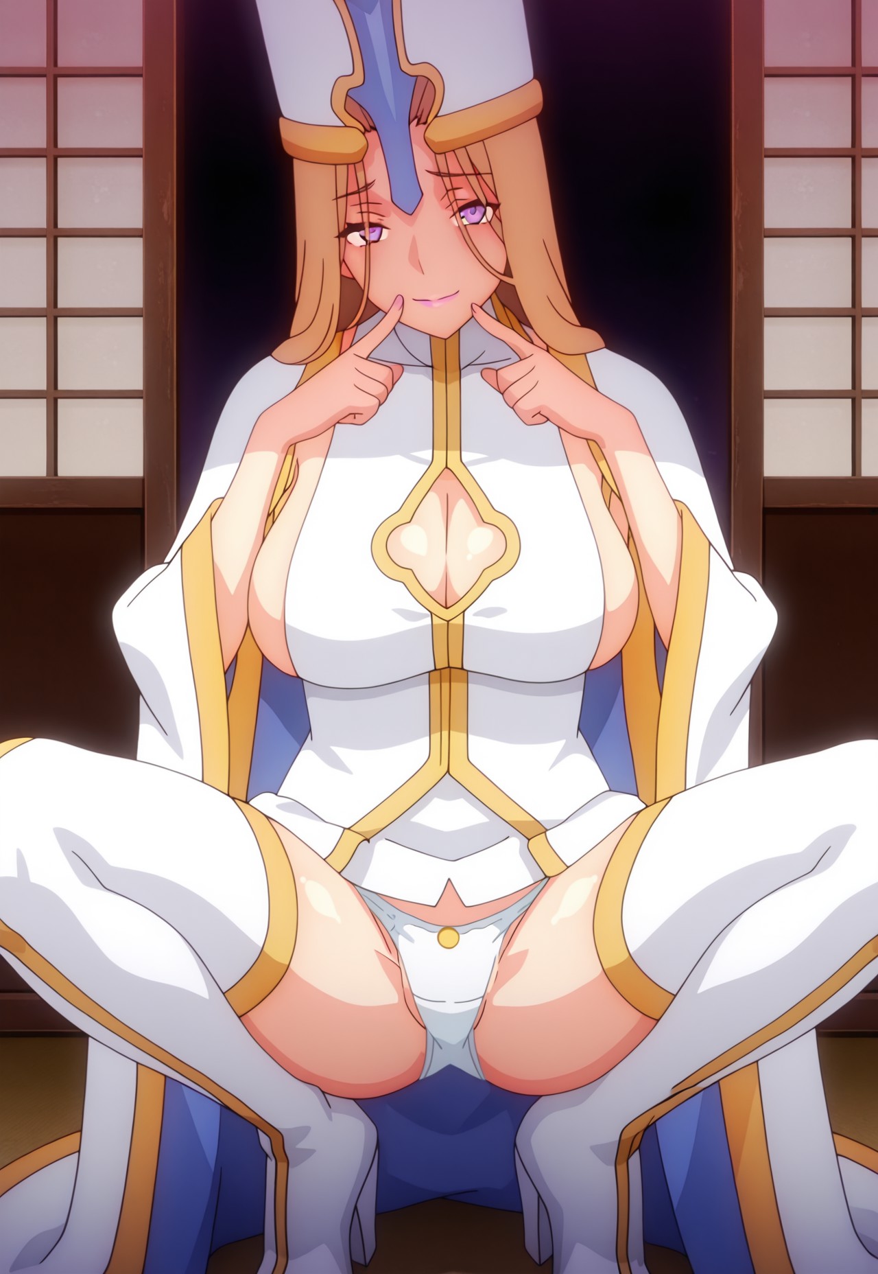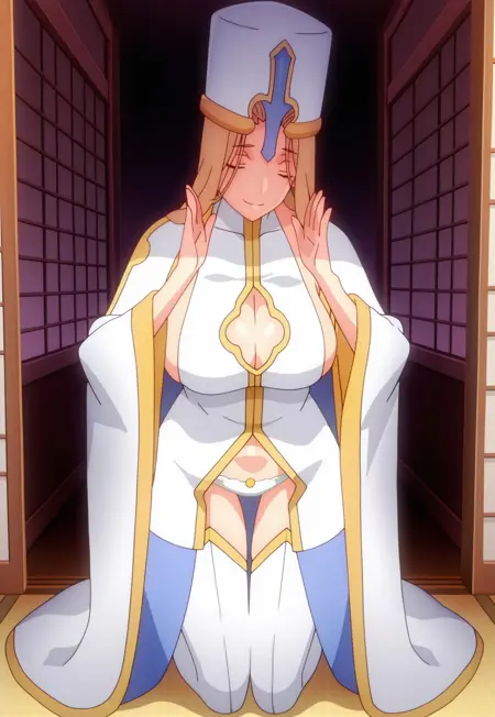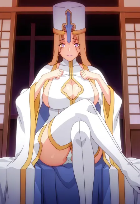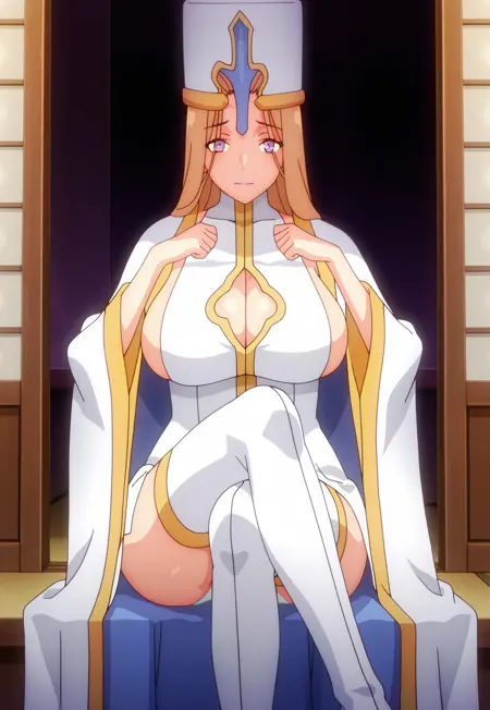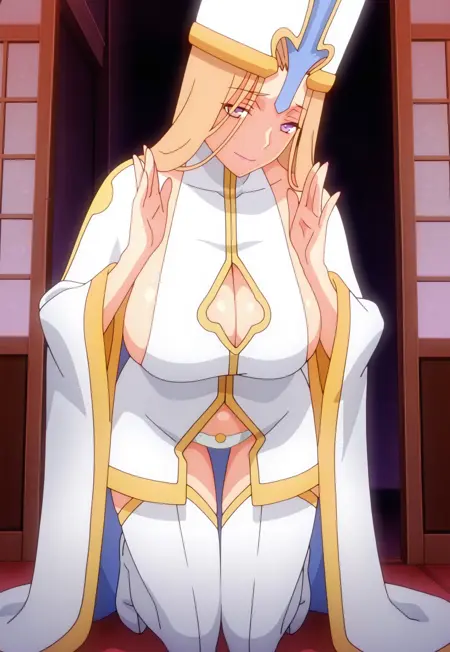 タグ:司教, 茶色の髪, 紫の目, ピンクの唇, 主教冠, 白い thighhighs, 大きな胸, サイドボブ, 胸元の切り抜き, 衣装の切り抜き, へそ, 白いパンティ, 下着, 白いドレス, タートルネックドレス, 広い袖, 太ももブーツ, ブーツ, 白い手袋, 肘まで手袋