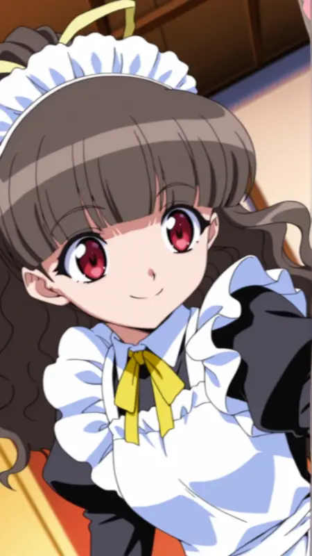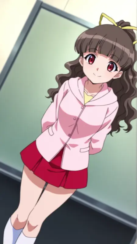 外观:棕色头发,长发,波浪发,红眼睛,发带,齐刘海,马尾辫,黄色丝带,