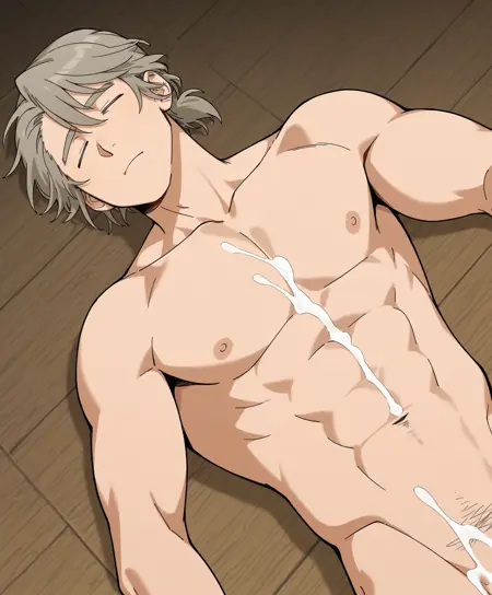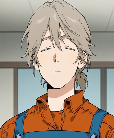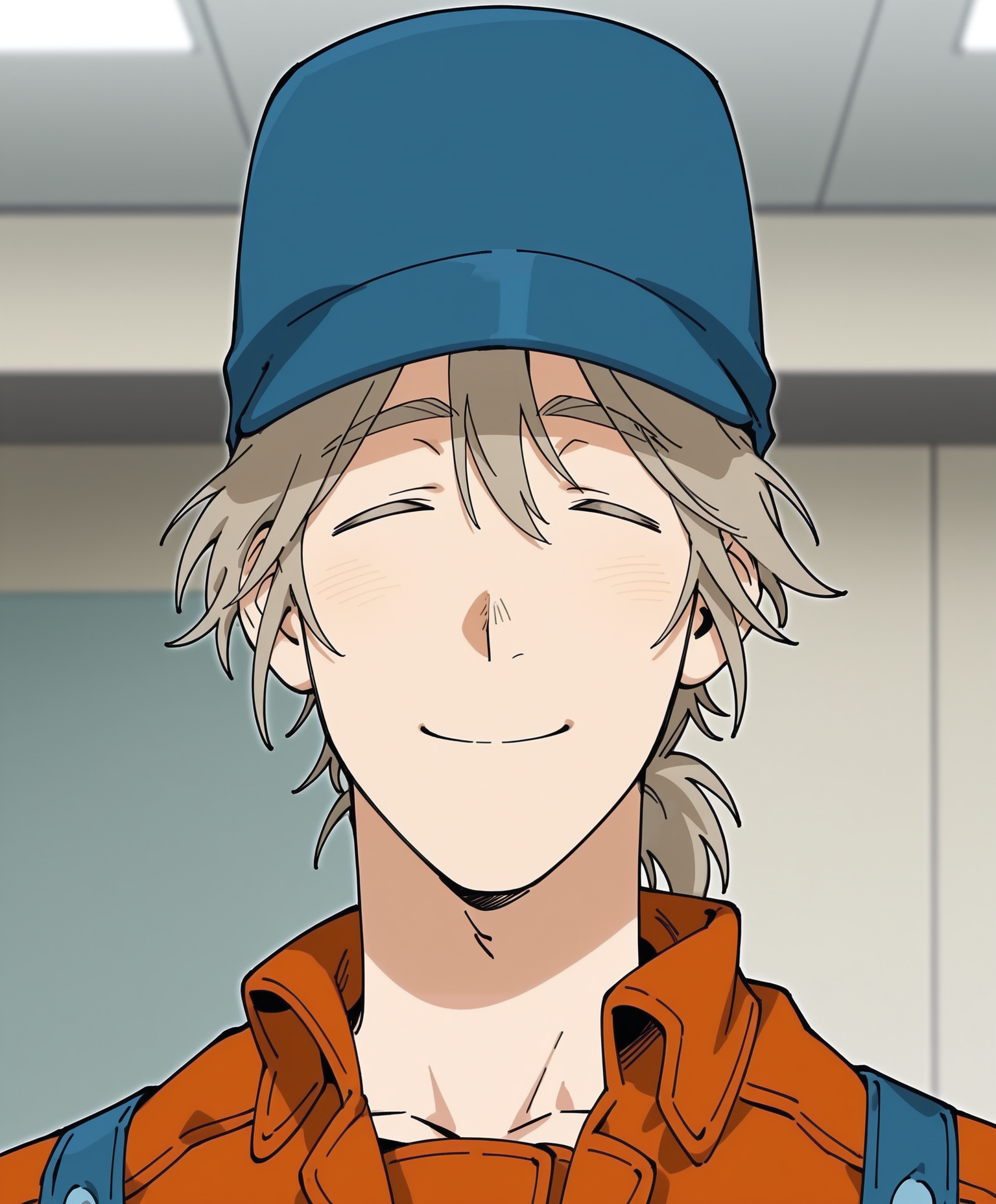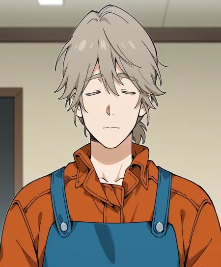 リトルA、目を閉じた、糸目、茶色の髪、1歳の男の子、オレンジ色のシャツ、青いエプロン