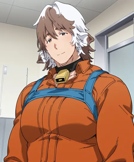 ミルトン、ウシの耳、白と茶色の毛、動物の耳、鈴、カウボーイ、首輪の鈴、オレンジ色のボディスーツ、青色のハーネス、タグ、((大きな胸筋:1.4))