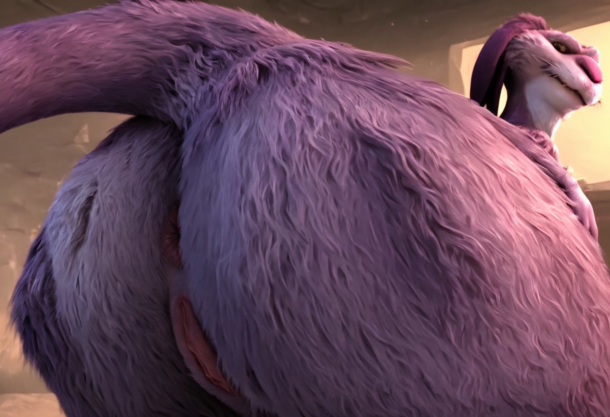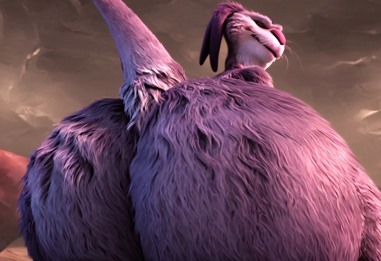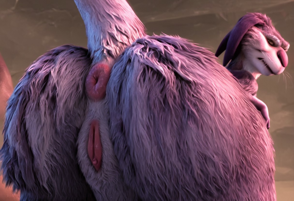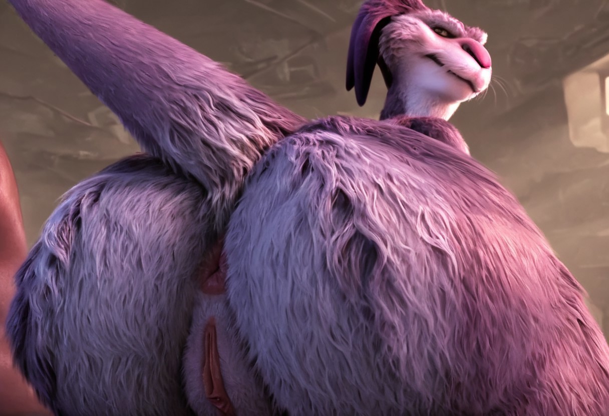 raziceage, kangaroo, pink nose, purple floppy ears, purple fur, white fur, dirty round teeth, brown eyes, 3D, cgi, female, furry,