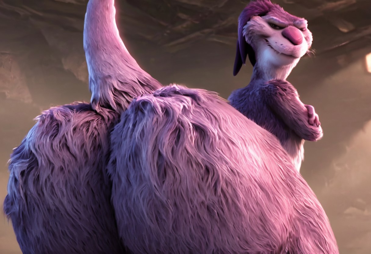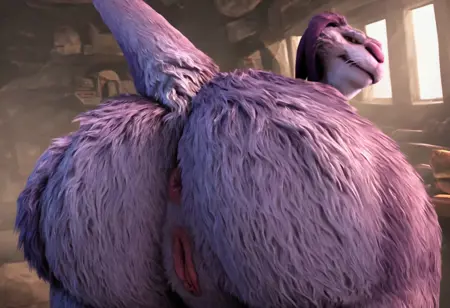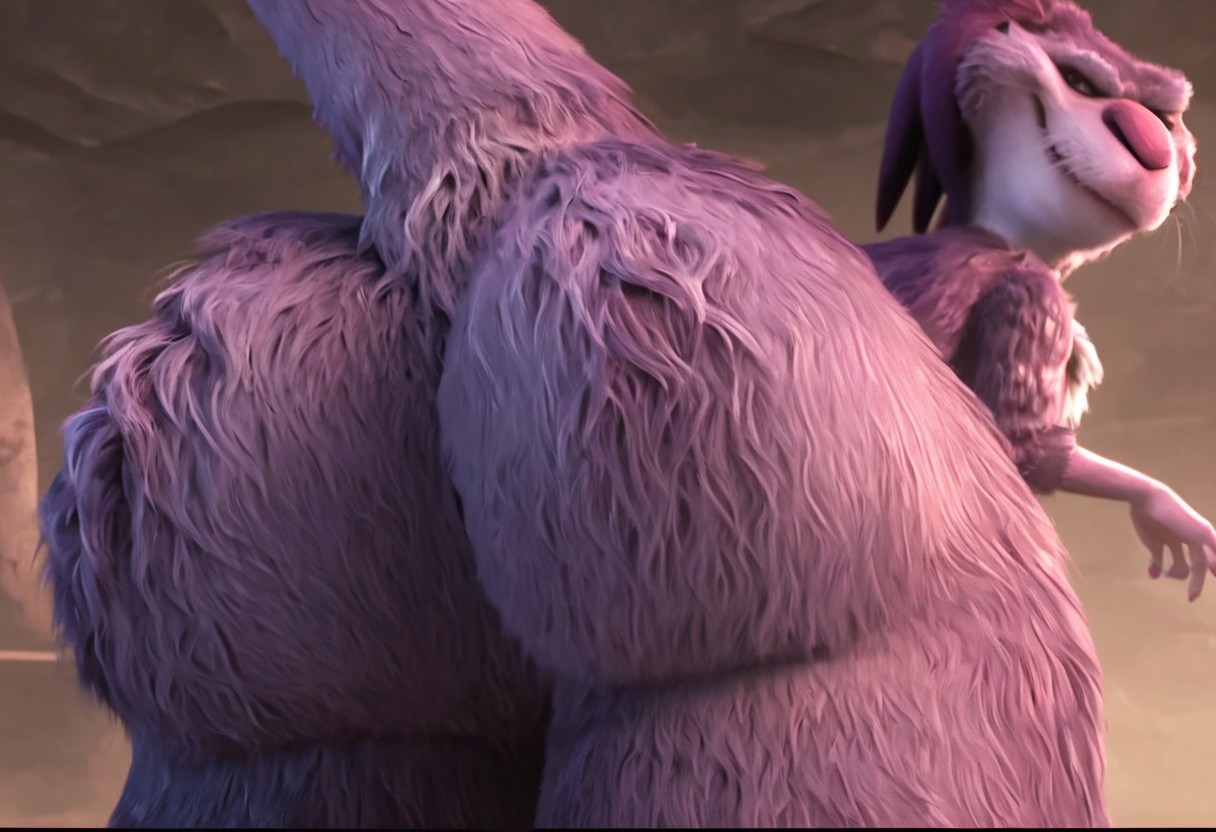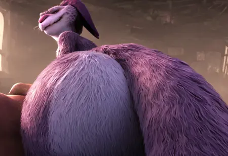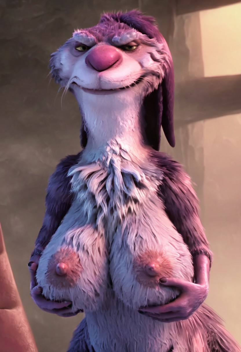 raziceage, kangaroo, pink nose, purple floppy ears, purple fur, white fur, dirty round teeth, brown eyes, 3D, cgi, female, furry,