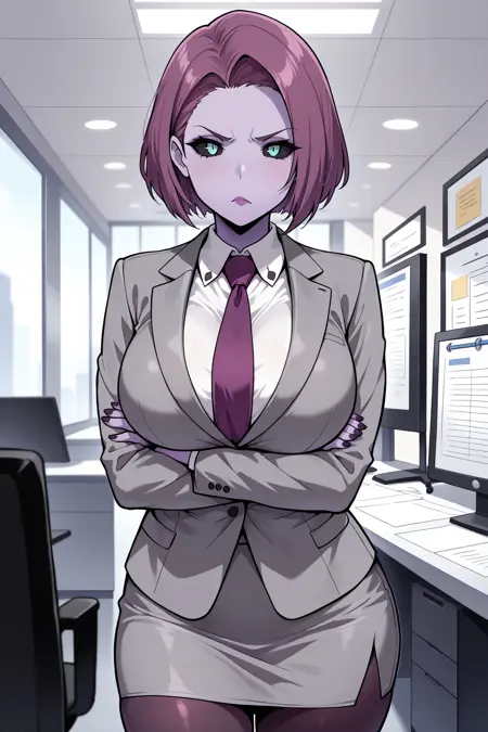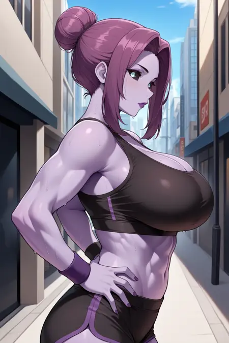 헤스티아의 경우 "fehst, 짧은 머리, 검은 공막, 보라색 피부, 보라색 립스틱, 보라색 머리카락, 검은 카펠렛, 높은 칼라, 검은 촐러, 보라색 드레스, 검은 드레스, 줄리엣 슬리브, 이톤 드레스, 금장식, 가슴 노출, 골반 커튼, 보라색 장갑, 검은 투오프, 허벅지 부츠"를 추가하세요.