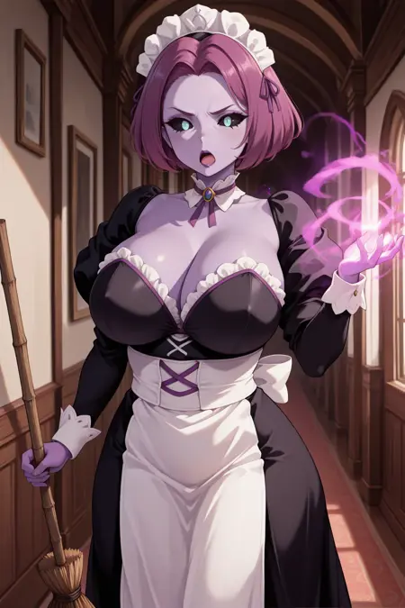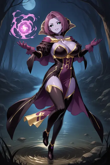 마를라의 경우 "femrl, 한 개의 머리 땋기, 옆머리, 검은 공막, 보라색 피부, 보라색 립스틱, 보라색 머리카락, 검은 카펠렛, 높은 칼라, 검은 촐러, 보라색 드레스, 검은 드레스, 줄리엣 슬리브, 이톤 드레스, 금장식, 가슴 노출, 골반 커튼, 보라색 장갑, 검은 투오프, 허벅지 부츠"를 추가하세요.
