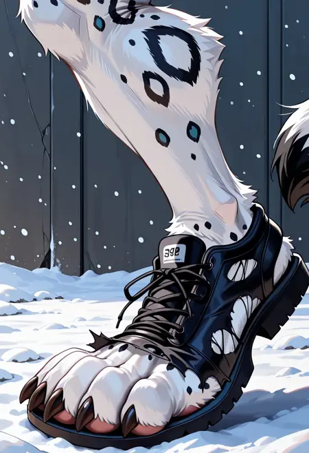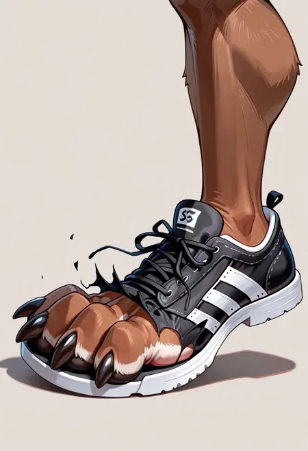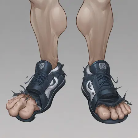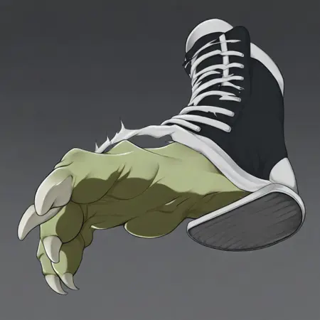 靴から足が飛び出す様子を学習したLoRAです。このモデルは、足が靴から引き裂かれたり飛び出したりするアップ画像で学習されました。人間の足、フューリーな足、うろこの足を含みます。趾の数に時々問題が生じることがあります。さまざまな靴の種類もサンプリングされています。