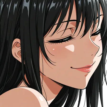 (white background),(simple background), best quality, amazing quality, very aesthetic, newest,(anime_screencap:1.3), (anime_coloring:1.3), official style, perfect quality, deep skin,fantasy,1 female,make-up,lips,solo, ,looking_at_viewer,from side,face focus, closed eyes,good face,evil smile,