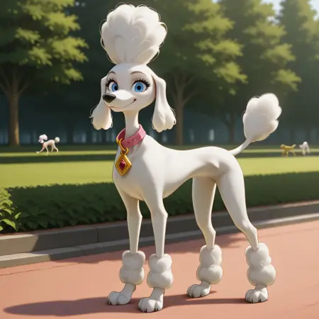 dog, poodle, white fur, fluffy head fur, blue eyes, black nose, dog ears, fluffy ankles, fluffy tail tip, pink collar, gold dog tag,