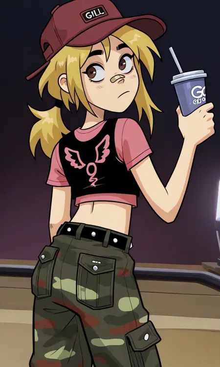 1girl,baseball cap, red headwear, messy hair, blonde hair, ponytail, single sidelock,black stripes on sidelock,brown eyes, bandaid on nose, cropped shirt, crop top,t-shirt, black tank top over t-shirt, pink shirt,pink wing print, black-trimmed sleeves,short sleeves, navel, black belt, studded belt, camouflage pants, green pants,baggy pants