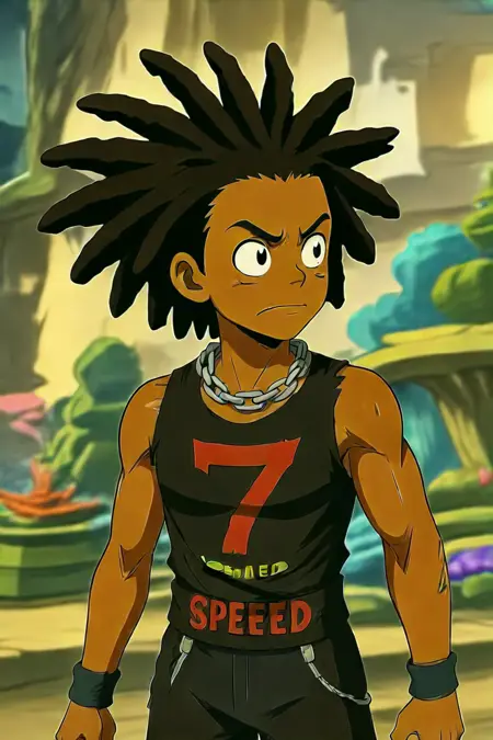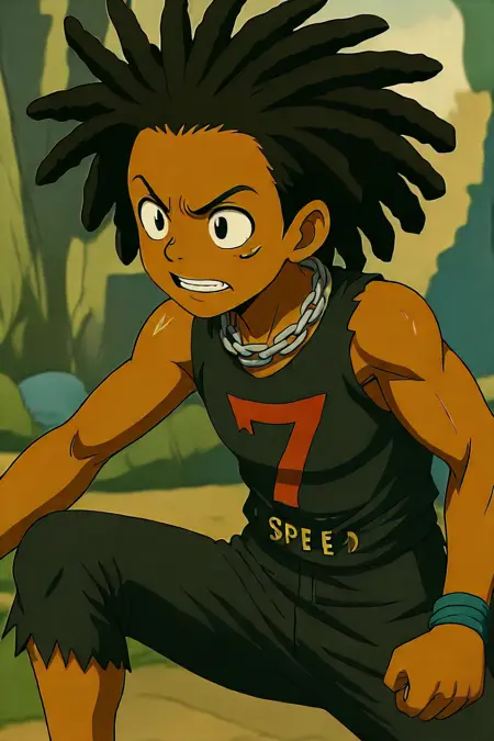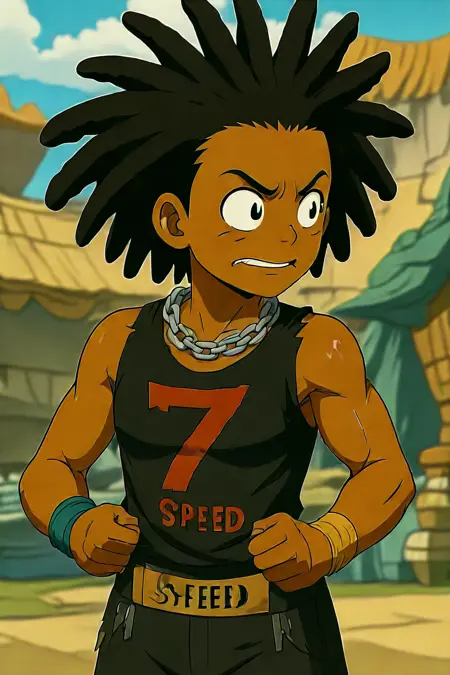 Aisho는 키 5피트 9인치의 체격이 우아하고 검은 피부를 가진 아프리카계 남성으로, 날씬하고 민첩한 체형을 지녔습니다. 그의 짧고 뾰족하며 부풀어 오른 검은 더드락 헤어스타일은 인상적인 실루엣을 만듭니다. 그의 외모는 검은 색 소매 없는 티셔츠에 두꺼운 붉은 페인트로 쓰인 “SPEED”와 숫자 7이 특징적이며, 가슴에는 은색 체인 목걸이가 빛을 반사하고, 찢어진 검은 바지가 그의 전투 준비 자세를 완성합니다.