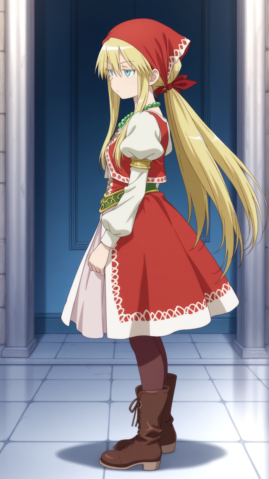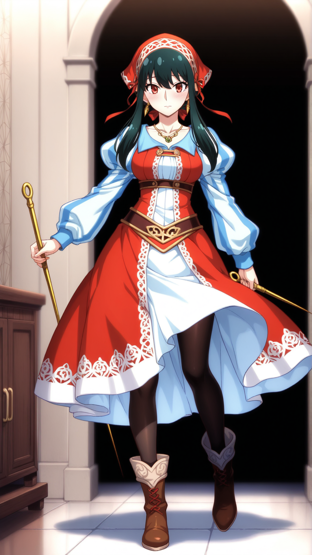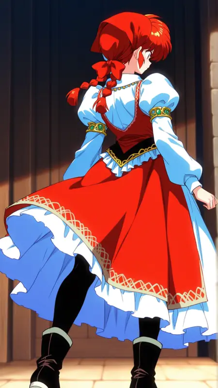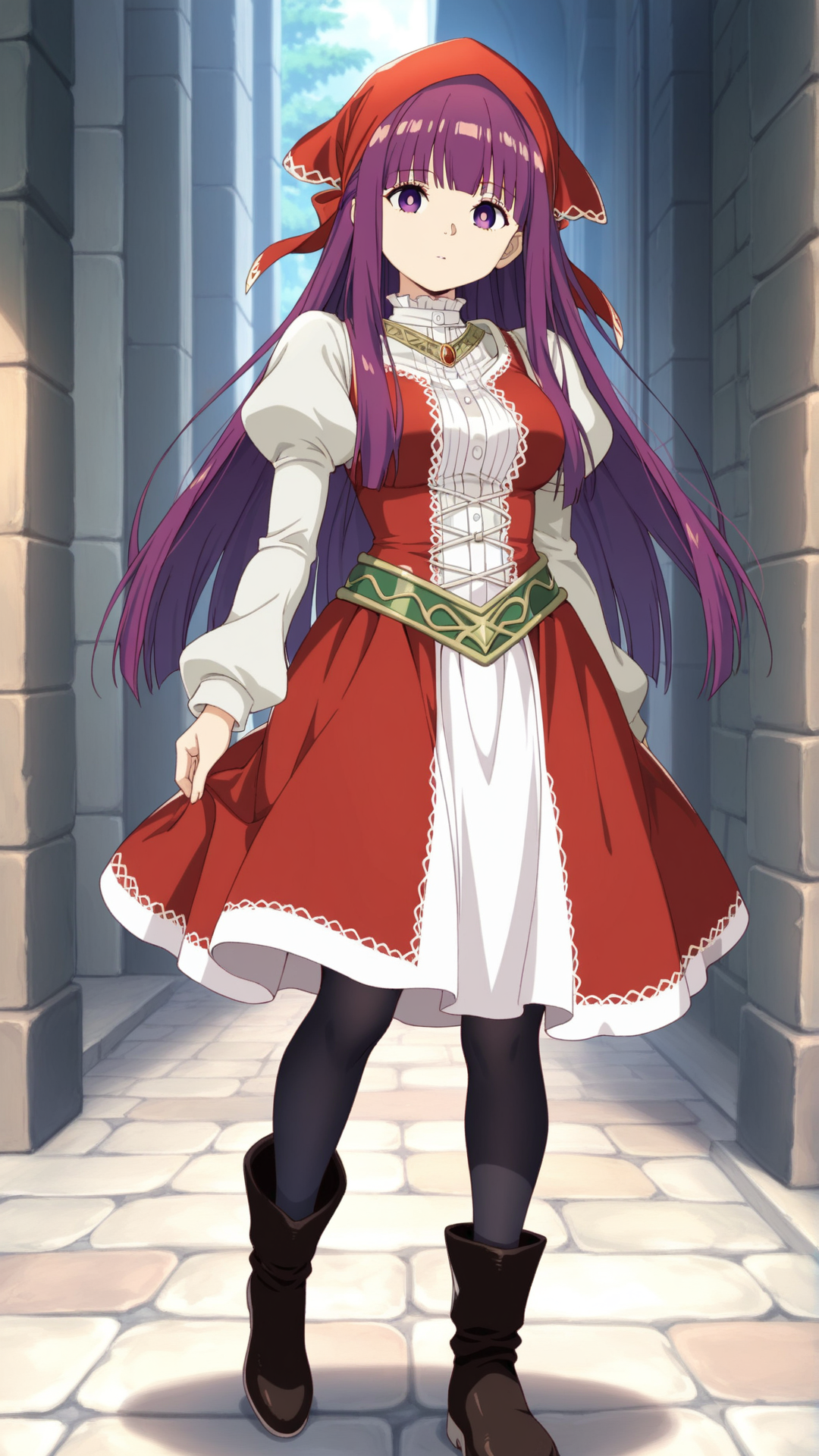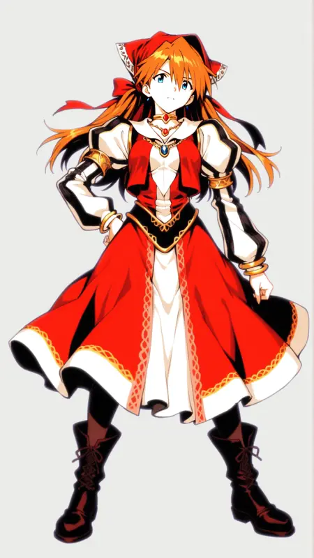 触发词:cordelia_emery\(saga frontier2\)\(cosplay\),红色头巾, 发带, 珠宝, 发结, 连衣裙, 蓬松袖子, 靴子, 长袖, 连裤袜,