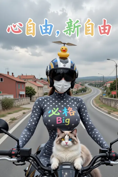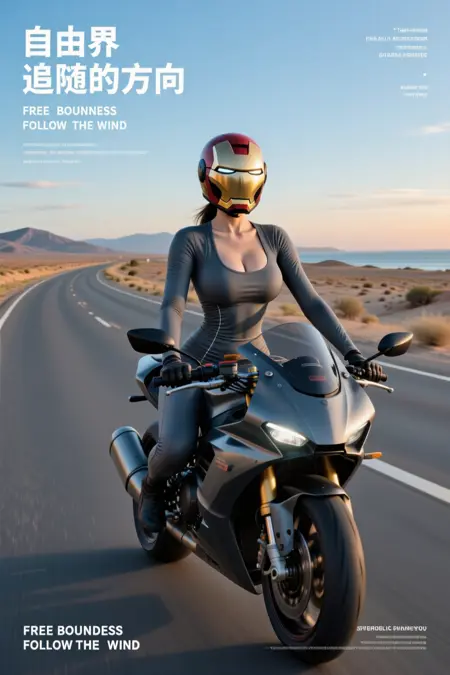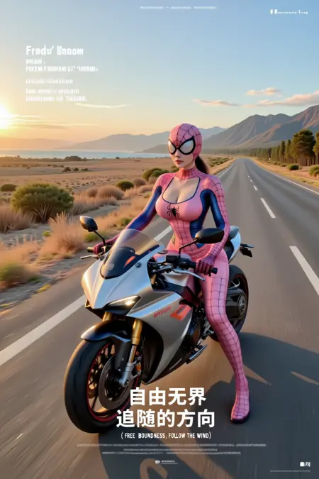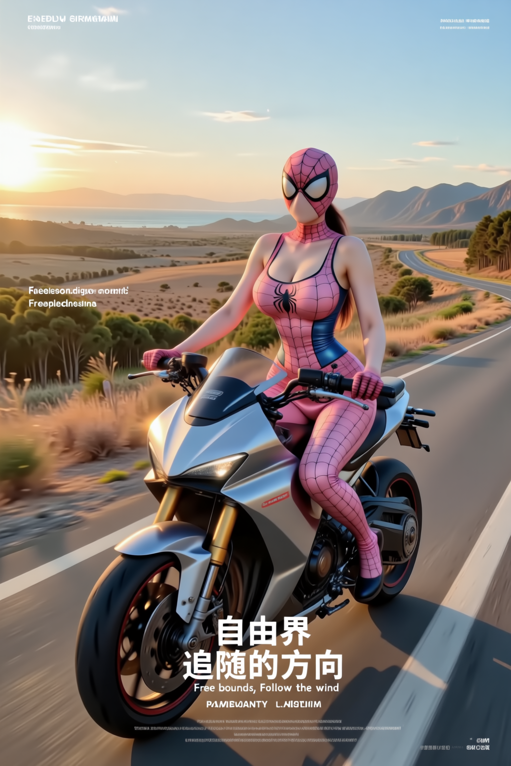 프롬프트: 젊고 쿨한 오토바이 테마의 포스터로, 중앙에는 분홍색 스파이더맨 헤드기어를 쓰고 앞선 디자인의 여성용 전기 자전거를 타고 있는 여성이 그려져 있다. 그녀는 조여진 스파이더맨 유니폼을 입고, 매력적인 몸매와 큰 가슴, 자신감 있는 자세를 보이고 있다. 배경은 넓게 뻗은 공터의 도로로, 사막, 멀리 떨어진 산, 또는 해안선이 될 수 있으며, 하늘은 맑은 푸른 하늘 또는 붉은 노을이 띤 하늘로, 넓고 자유로운 분위기를 연출한다. 화면에는 자유에 대한 설명을 담은 중문 및 영문 슬로건 또는 짧은 문구를 적절히 배치할 수 있으며, 예를 들어 “자유는 경계가 없다”, “바람의 방향을 따라가라”(Free is boundless, Follow the wind)와 같은 문구와 간결하고 강력한 광고 문구를 포함한다. 전체적인 화면 스타일은 세련되고 쿨하며 현대적이고 자유로운 분위기를 풍기며, 색상 조합은 생동감 있고 강렬하고, 석양의 측면 조명과 강력한 명암 효과를 통해 주체의 역동성과 힘을 부각시켜 포스터 수준의 시각적 효과를 창출한다. 초고해상도이며 세부가 정교하고 구성이 우수하다.