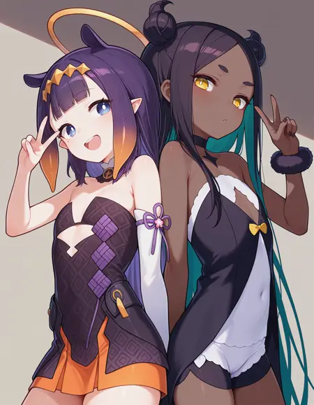 roroboshi、暗色肌の女性、非常に濃い肌、黄色い目、短い眉毛、非常に長い髪、黒髪、二つ結び、髪の角、分け目のある前髪、黒いチョーカー、肩出し、短いドレス、ツートーンドレス、ストラップレスドレス、ダイヤモンドカットアウト、手首の cuffs、黒いショートパンツ、足出し、プラットフォームヒール