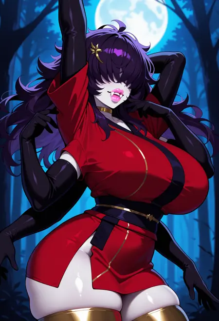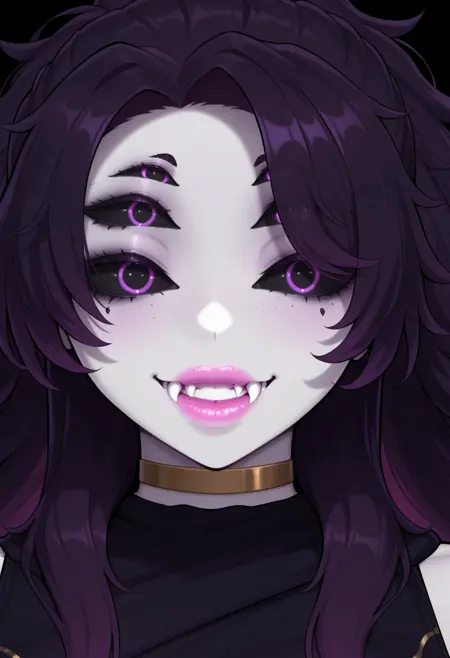 gaza4an1ha, 1girl, thick girl, extra thick, huge breasts, 紫色头发, 凌乱头发, 粉色口红, 妆容, 粉色嘴唇, 饱满嘴唇, 苍白皮肤, 有色皮肤, 尖牙, 牙齿, 多条手臂, 六条手臂,强度 0.8-1