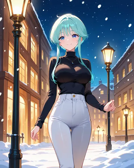 Yukime, yuki, pants, night, snow, black turtleneck, short hair, aqua hair, 1girl, solo